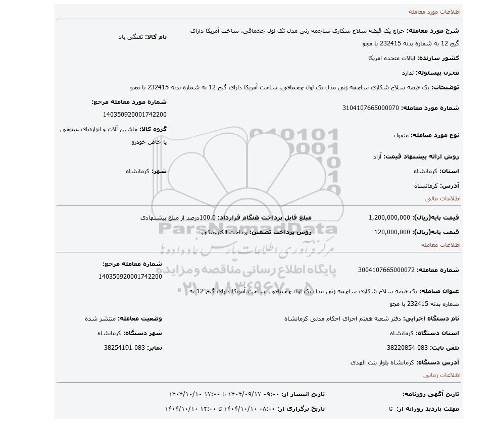 مزایده عمومی مزایده یک قبضه سلاح شکاری ساچمه زنی مدل تک لول چخماقی ساخت آمریکا دارای گیج 12 به شماره بدنه 232415 با مجو برگزار میگردد. از کلیه افراد متخصص و شرکتهای واجد شرایط دعوت به عمل میآید تا در این مزایده با کد خبرگزاری پارس نماد : 9939193 شرکت نمایند تاریخ شروع مزایده : 1404/09/12 مهلت شرکت در مزایده: تا پایان روز 1404/10/10 مکان برگزاری اموال واگذاری استانهای مزایدات استان کرمانشاه و دستهبندیهای مربوط به این حراجی متفرقه, اسلحه شکاری و لوازم صیادی میباشد.