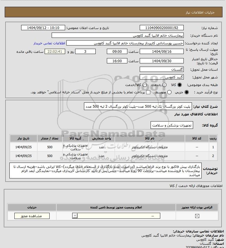 نام سازمان خریدار: بیمارستان خاتم الانبیا گنبد کاووس