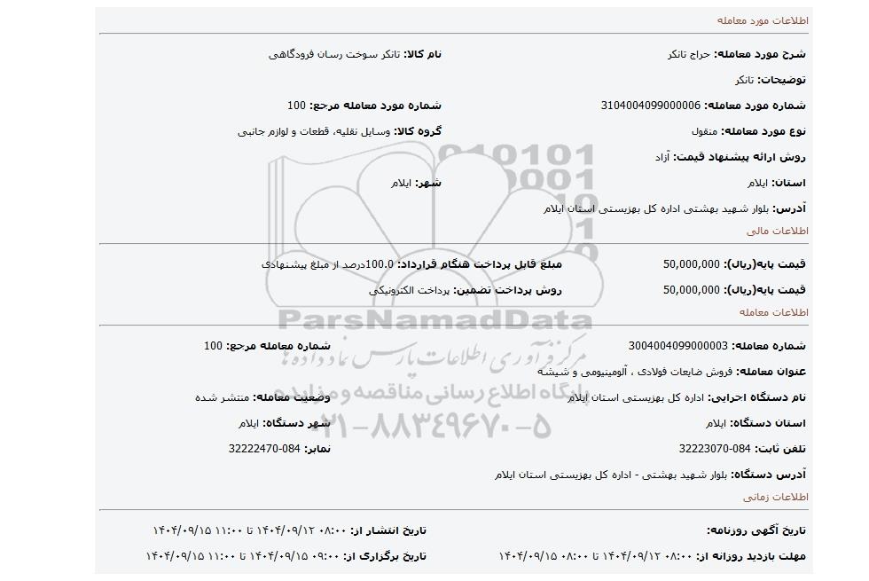 مزایده عمومی مزایده تانکر برگزار میگردد. از کلیه افراد متخصص و شرکت‌های واجد شرایط دعوت به عمل می‌آید تا در این مزایده با کد خبرگزاری پارس نماد : 9939378 شرکت نمایند تاریخ شروع مزایده : 1404/09/12 مهلت شرکت در مزایده: تا پایان روز 1404/09/15 مکان برگزاری اموال واگذاری استان‌های مزایدات استان ایلام و دسته‌بندی‌های مربوط به این حراجی قطعات خودرو, آهن آلات, ماشین آلات سنگین و نیمه سنگین میباشد.