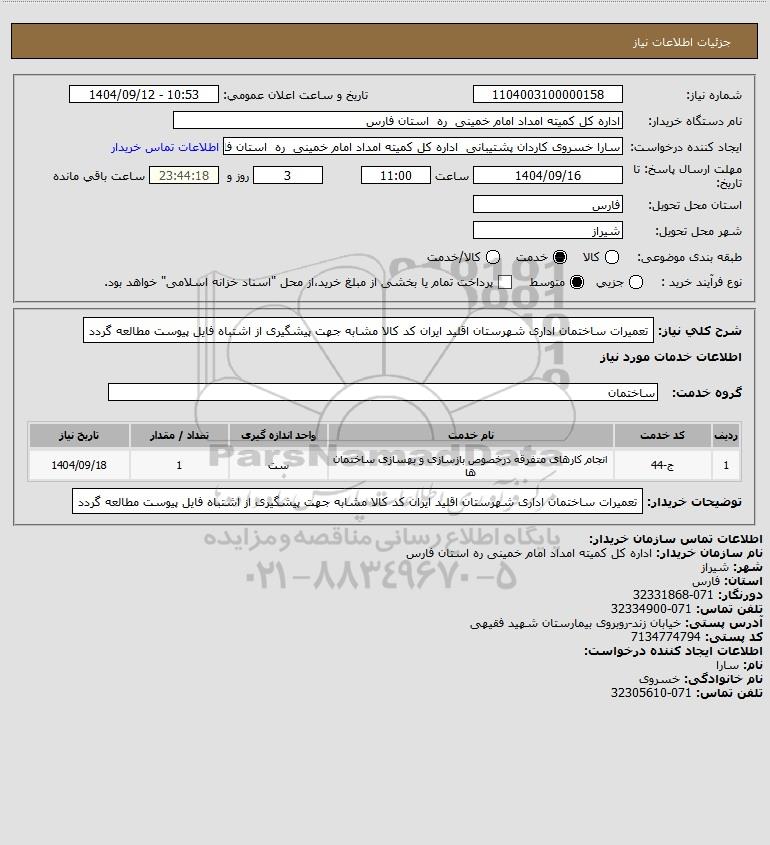 شرح کلی نیاز: تعمیرات ساختمان اداری شهرستان اقلید ایران کد کالا مشابه جهت پیشگیری از اشتباه فایل پیوست مطالعه گردد