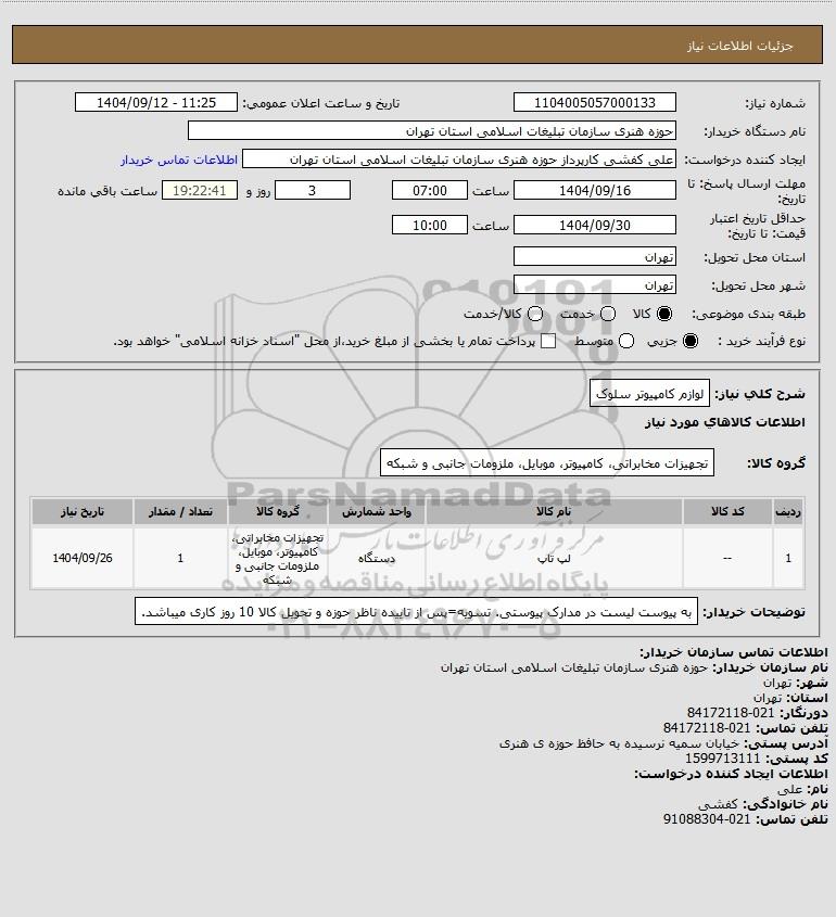 | 1 | -- | لپ تاپ | دستگاه | تجهیزات مخابراتی، کامپیوتر، موبایل، ملزومات جانبی و شبکه | 1 | 1404/09/26 |