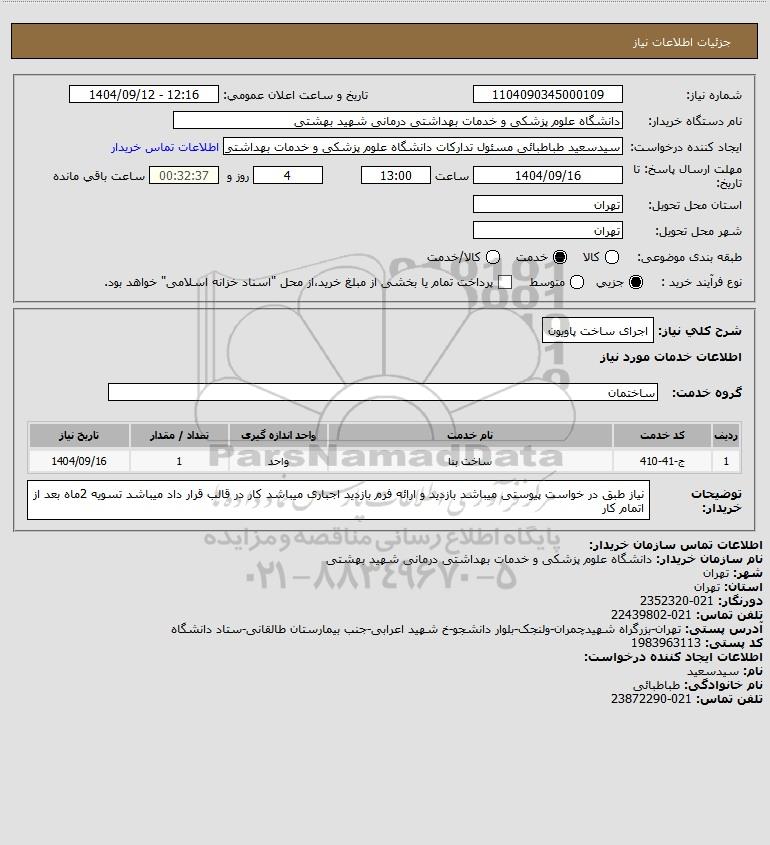 استعلام بها و موضوع استعلام استعلام اجرای ساخت پاویون به اطلاع کلیه شرکتها و افراد متخصص واجد شرایط میرساند، آگهی گذار در نظر دارد از طریق استعلام بها، نسبت به انتخاب و دریافت پیشنهادات اقدام نماید. این استعلام با کد آگهی ثبت شده در سامانه خبرگزاری پارس نماد : 9940487 منتشر شده است. مشخصات استعلام : تاریخ شروع استعلام: 1404/09/12 آخرین مهلت ارسال پیشنهاد قیمت : 1404/09/16 و محل اجرای پروژه : استان تهران میباشد. استعلام قیمت مورد درخواست : استعلام اجرای ساخت پاویون با دستهبندیهای تخصصی و گروه های مرتبط : ساختمان, استعلام اطلاع رسانی میگردد.
