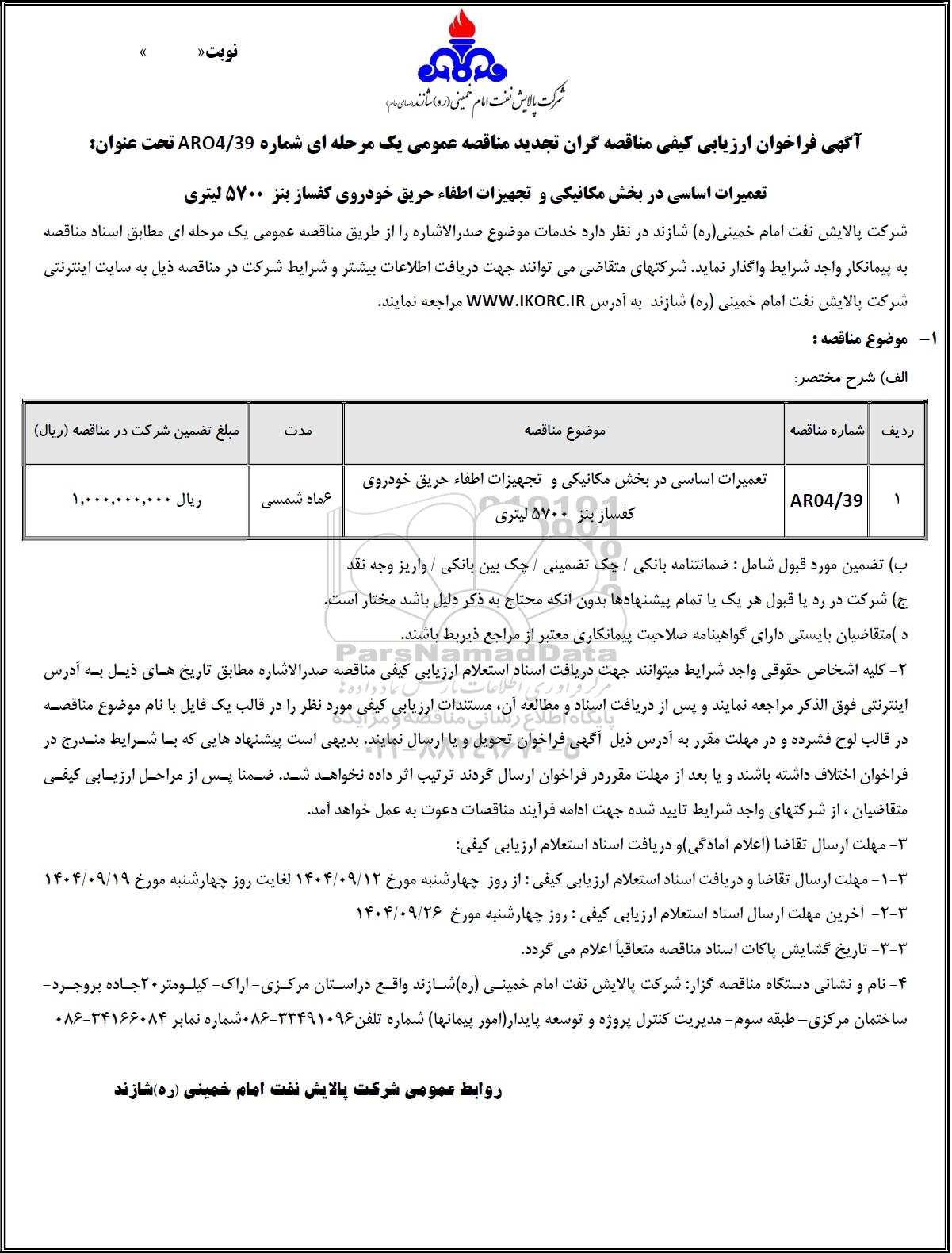 1 AR04/39 تعمیرات اساسی در بخش مکانیکی و  تجهیزات اطفاء حریق خودروی کفساز بنز  5700 لیتری 6 ماه شمسی 1.000.000.000 ریال