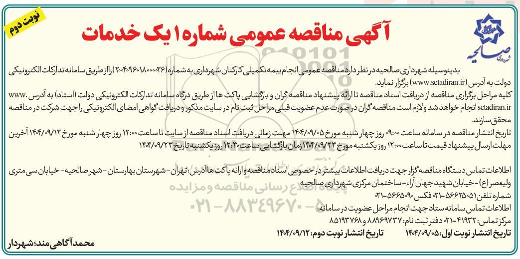 بدینوسیله شهرداری صالحیه در نظر دارد مناقصه عمومی انجام بیمه تکمیلی کارکنان به شماره 2004096018000026 را از طریق سامانه تدارکات الکترونیکی دولت به آدرس سایت ستاد ایران برگزار نماید. کلیه مراحل برگزاری مناقصه از دریافت اسناد مناقصه تا ارائه پیشنهاد مناقصه گران و بازگشایی پاکتها از طریق درگاه سامانه تدارکات الکترونیکی دولت (ستاد) به آدرس  سایت ستاد ایران انجام خواهد شد و لازم است مناقصه گران در صورت عدم عضویت قبلی مراحل ثبت نام در سایت مذکور و دریافت گواهی امضای الکترونیکی را جهت شرکت در مناقصه محقق سازند. تاریخ انتشار مناقصه در سامانه ساعت 09:00 روز چهارشنبه مورخ 1404.9.5