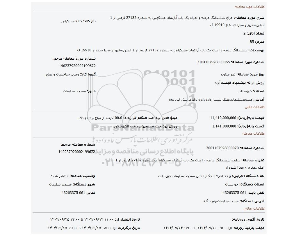 مزایده عمومی مزایده ششدانگ عرصه و اعیان یک باب آپارتمان مسکونی به شماره 27132 فرعی از 1 اصلیمفروز و مجزا شده از 19910 ف برگزار میگردد. از کلیه افراد متخصص و شرکتهای واجد شرایط دعوت به عمل میآید تا در این مزایده با کد خبرگزاری پارس نماد : 9941149 شرکت نمایند تاریخ شروع مزایده : 1404/09/12 مهلت شرکت در مزایده: تا پایان روز 1404/09/25 مکان برگزاری اموال واگذاری استانهای خوزستان و دستهبندیهای مربوط به این حراجی املاک و زمین میباشد.
