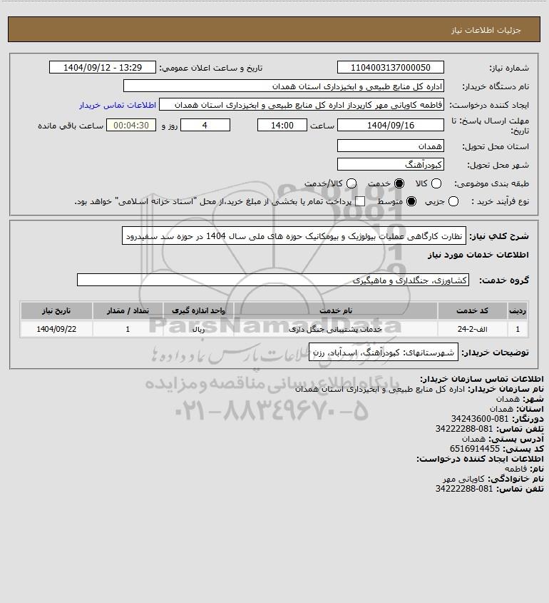 شرح کلی نیاز: نظارت کارگاهی عملیات بیولوژیک و بیومکانیک حوزه های ملی سال 1404 در حوزه سد سفیدرود