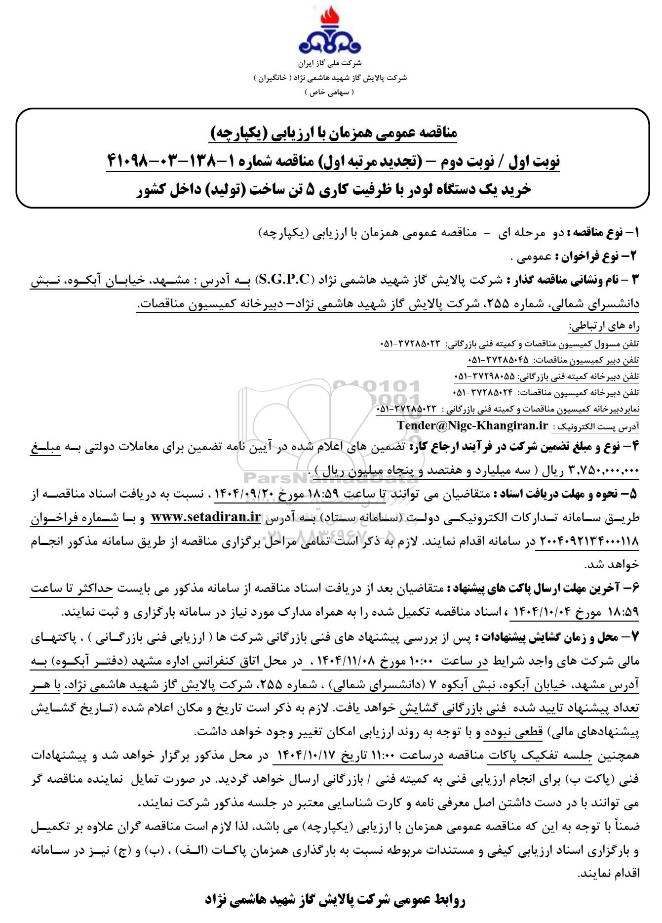 7- محل و زمان گشایش پیشنهادات : پس از بررسی پیشنهادهای فنی بازرگانی شرکتها ( ارزیابی فنی بازرگانی ) ، پاکت های مالی شرکت های واجد شرایط در ساعت 10 مورخ 1404.11.8 ، در محل اتاق کنفرانس اداره مشهد (دفتر آب کوه) به آدرس مشهد ، خیابان آبکوه ، نبش آبکوه 7 (دانشسرای شمالی) ، شماره 255 شرکت پالایش گاز شهید هاشمی نژاد، با حداقل سه پیشنهاد تایید شده فنی بازرگانی گشایش خواهد یافت. لازم به ذکر است تاریخ و مکان اعلام شده ( تاریخ گشایش پیشنهادهای مالی) قطعی نبوده و با توجه به روند ارزیابی امکان تغییر وجود خواهد داشت.