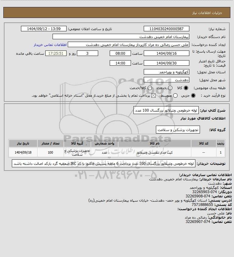 شرح کلی نیاز: لوله خرطومی ونتیلاتور بزرگسال 100 عدد