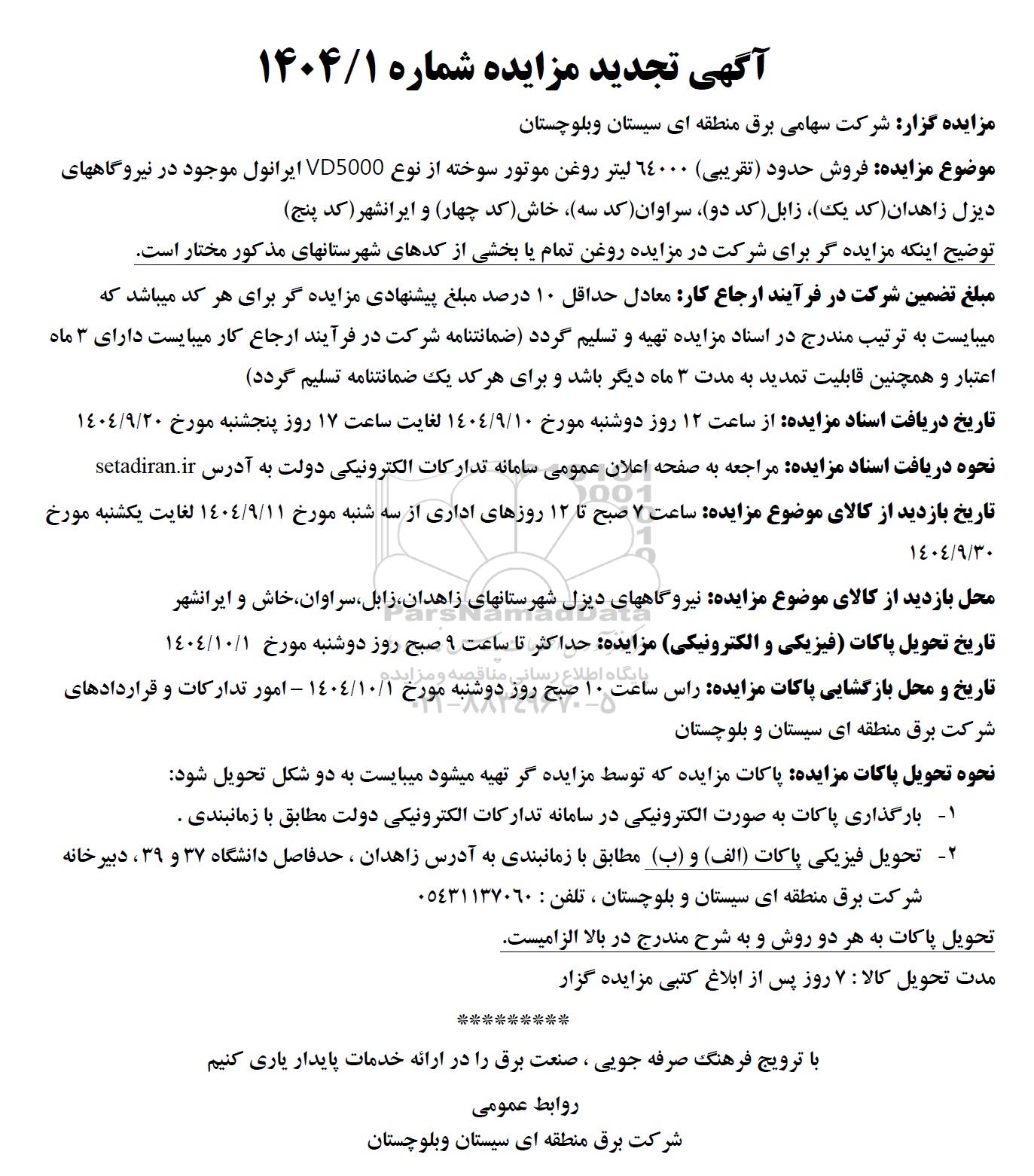 موضوع مزایده فروش حدود (تقریبی) 64000 لیتر روغن موتور سوخته از نوع VD5000 ایرانول موجود در نیروگاههای دیزل زاهدان (کد یک) ، زابل (کد دو) سراوان (کد سه) ، خاش (کد چهار) و ایرانشهر (کد پنج)