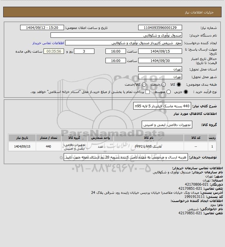 شرح کلی نیاز: 440 بسته ماسک فیلتردار 5 لایه n95