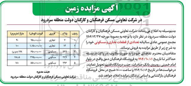 بدینوسیله به اطلاع میرساند: شرکت تعاونی مسکن فرهنگیان و کارکنان دولت منطقه سردرود در نظر دارد با توجه به مصوبه مورخه 1404/02/27 مجمع عمومی عادی سالیانه تعدادی از قطعات تجاری و مسکونی خود را به شرح زیر از طریق مزایده به فروش برساند.
