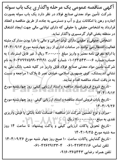 اشخاص حقوقی و حقیقی دارای توان اجرائی و مالی با دارا بودن مدارک مثبته فعالیت اشتغال میتوانند در ساعات اداری از روز چهارشنبه مورخ 1404.09.12 با ارائه معرفی نامه معتبر و واریز مبلغ 3.000.000 ریال ( غير قابل استرداد ) به حساب شماره 0101245430006 شماره کارت 6037997599032191 به نام شرکت تأمین مواد معدنی صنایع فولاد قابل واریز در کلیه شعب بانک ملی به نشانی اندیمشک کوی جمهوری اسلامی خیابان نصر 5 پلاک 1 مراجعه و نسبت به دریافت اسناد مناقصه اقدام نمایند.