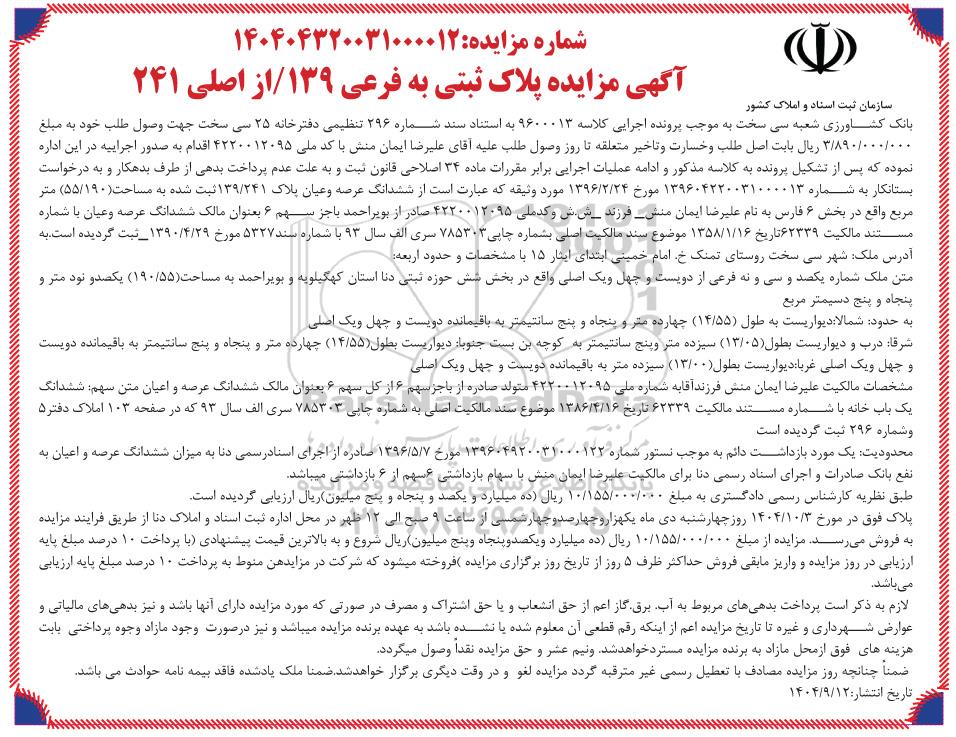 آگهی مزایده پلاک ثبتی به فرعی 139 از اصلی 241