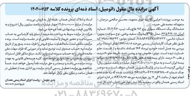 آگهی مزایده مال منقول اتومبیل اسناد ذمه ای پرونده کلاسه 140400753