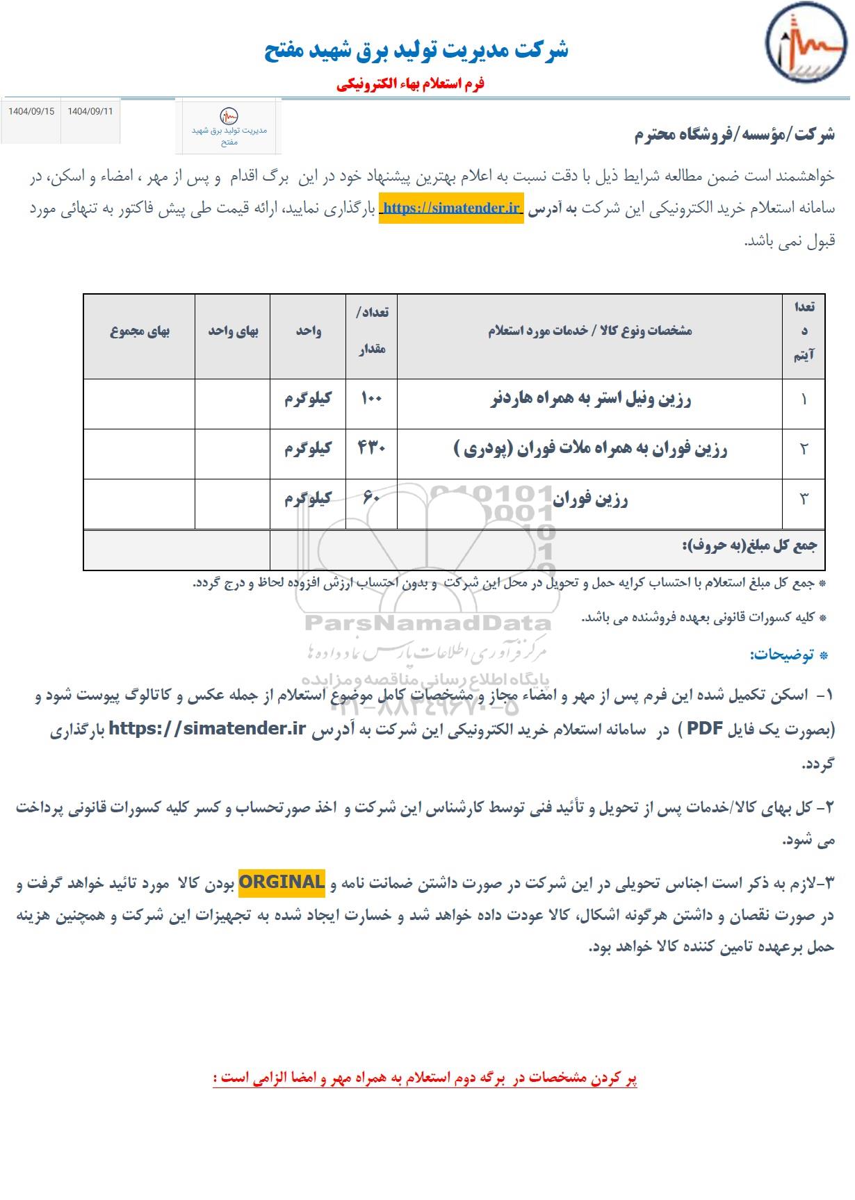 خواهشمند است ضمن مطالعه شرایط ذیل با دقت نسبت به اعلام بهترین پیشنهاد خود در این برگ اقدام و پس از مهر ، امضاء و اسکن در سامانه استعلام خرید الکترونیکی این شرکت به آدرس https://simatender.ir بارگذاری نمایید ارائه قیمت طی پیش فاکتور به تنهایی مورد قبول نمی باشد.