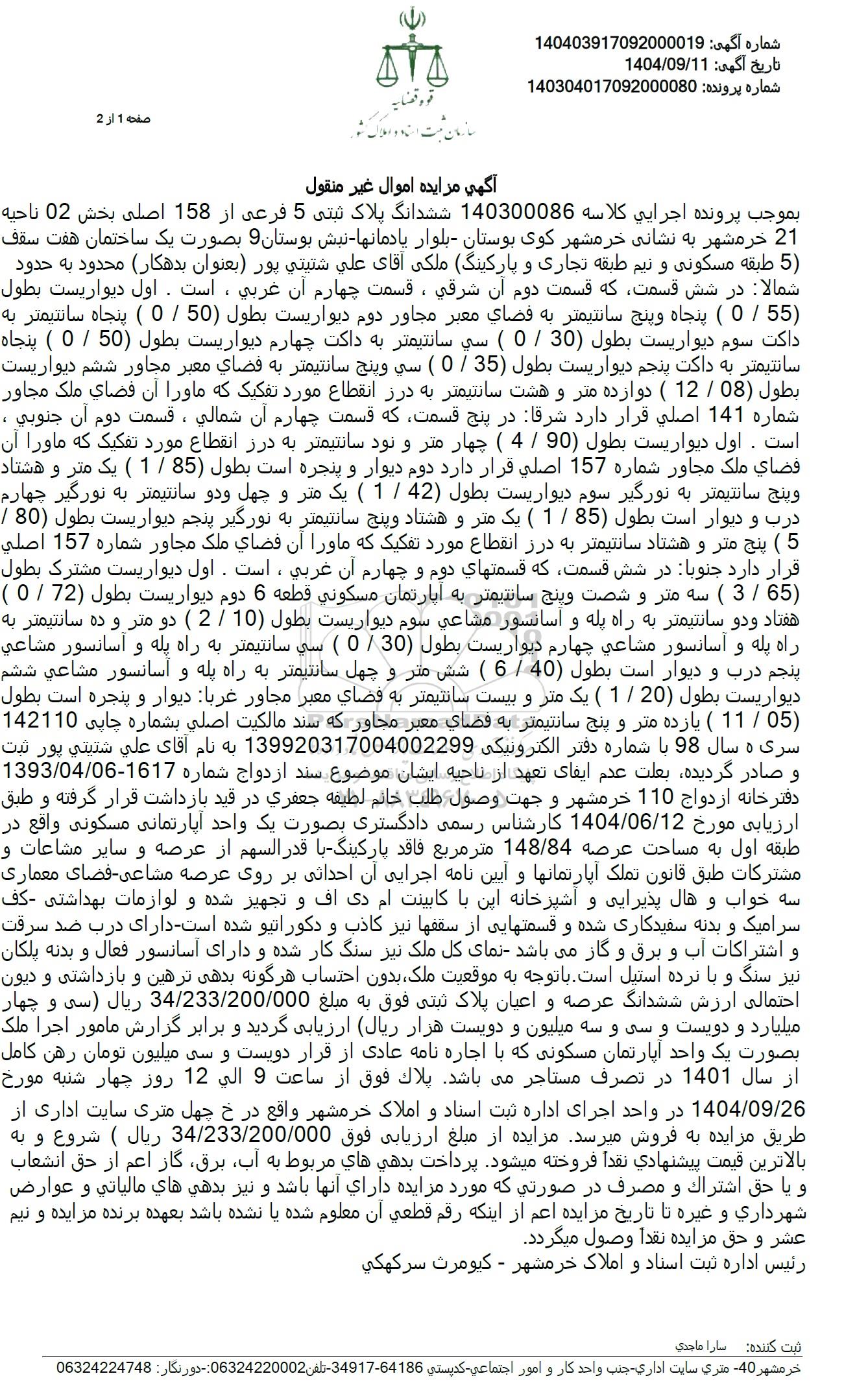بموجب پرونده اجرایی کلاسه 140300086 ششدانگ پلاک ثبتی 5 فرعی از 158 اصلی بخش 02 ناحیه 21 خرمشهر به نشانی خرمشهر کوی بوستان - بلوار یادمانها نبش بوستان 9 بصورت یک ساختمان هفت سقف 5) طبقه مسکونی و نیم طبقه تجاری و پارکینگ ملکی آقای علی شتیتی پور بعنوان بدهکار محدود به حدود شمالا در شش قسمت که قسمت دوم آن شرقی ، قسمت چهارم آن غربی، است. اول دیواریست بطول (55 . 0 ) پنجاه وپنج سانتیمتر به فضای معبر مجاور دوم دیواریست بطول 50 . 0 ) پنجاه سانتیمتر به داکت سوم دیواریست بطول 30 . 0 ) سی سانتیمتر به داکت چهارم دیواریست بطول (50 . 0 ) پنجاه سانتیمتر به داکت پنجم دیواریست بطول 35 . 0 ) سی وینج سانتیمتر به فضای معبر مجاور ششم دیواریست بطول (08 . 12 ) دوازده متر و هشت سانتیمتر به درز انقطاع مورد تفکیک که ماورا آن فضای ملک مجاور شماره 141 اصلی قرار دارد شرقا در پنج قسمت که قسمت چهارم آن شمالی ، قسمت دوم آن جنوبی . است. اول دیواریست بطول 90 . 4 ) چهار متر و نود سانتیمتر به درز انقطاع مورد تفکیک که ماورا آن فضای ملک مجاور شماره 157 اصلی قرار دارد دوم دیوار و پنجره است بطول 85 . 1 ) یک متر و هشتاد وینج سانتیمتر به نورگیر سوم دیواریست بطول 42 . 1 ) یک متر و چهل و دو سانتیمتر به نورگیر چهارم درب و دیوار است بطول 85 . 1 ) یـ ) یک متر و هشتاد و پنج سانتیمتر به نورگیر پنجم دیواریست بطول 80 .(5) پنج متر و هشتاد سانتیمتر به درز انقطاع مورد تفکیک که ماورا أن فضای ملك مجاور شماره 157 اصلی قرار دارد جنوبا در شش قسمت که قسمتهای دوم و چهارم آن غربی، است. اول دیواریست مشترک بطول (65 . 3 ) سه متر و شصت و پنج سانتیمتر به آپارتمان مسکونی قطعه 6 دوم دیواریست بطول (72 . 0 ) هفتاد و دو سانتیمتر به راه پله و آسانسور مشاعی سوم دیواریست بطول 10 . 2 ) دو متر و ده سانتیمتر به راه پله و آسانسور مشاعی چهارم دیواریست بطول (30 . 0 ) سی سانتیمتر به راه پله و آسانسور مشاعی پنجم درب و دیوار است بطول (40 . 6) شش متر و چهل سانتیمتر به راه پله و آسانسور مشاعی ششم دیواریست بطول (20 . 1 ) یک متر و بیست سانتیمتر به فضای معبر مجاور عربا دیوار و پنجره است بطول 05 . 11 ) یازده متر و پنج سانتیمتر به فضای معبر مجاور که سند مالکیت اصلی بشماره چاپی 142110 سری 5 سال 98 با شماره دفتر الکترونیکی 139920317004002299 به نام آقای علی شتیتی پور ثبت و صادر گردیده بعلت عدم ایفای تعهد از ناحیه ایشان موضوع سند ازدواج شماره 1617-1393.04.06 دفترخانه ازدواج 110 خرمشهر و جهت وصول طلب خانم لطیفه جعفری در قید بازداشت قرار گرفته و طبق ارزیابی مورخ 1404.06.12 کارشناس رسمی دادگستری بصورت یک واحد آپارتمانی مسکونی واقع در طبقه اول به مساحت عرصه 148.84 متر مربع فاقد پارکینگ با قدر السهم از عرصه و سایر مشاعات و مشترکات طبق قانون تملک آپارتمانها و آیین نامه اجرایی آن احداثی بر روی عرصه مشاعی فضای معماری سه خواب و هال پذیرایی و آشپزخانه این با کابینت ام دی اف و تجهیز شده و لوازمات بهداشتی کف سرامیک و بدنه سفیدکاری شده و قسمتهایی از سقفها نیز کاذب و دکوراتیو شده است دارای درب ضد سرقت و اشتراکات آب و برق و گاز میباشد نمای کل ملک نیز سنگ کار شده و دارای آسانسور فعال و بدنه پلکان نیز سنگ و با نرده استیل است. با توجه به موقعیت ملک بدون احتساب هرگونه بدهی ترهین و بازداشتی و دیون احتمالی ارزش ششدانگ عرصه و اعیان پلاک ثبتی فوق به مبلغ 34.233.200.000 ریال سی و چهار میلیارد و دویست و سی و سه میلیون و دویست هزار ریال ارزیابی گردید و برابر گزارش مامور اجرا ملک بصورت یک واحد آپارتمان مسکونی که با اجاره نامه عادی از قرار دویست و سی میلیون تومان رهن کامل از سال 1401 در تصرف مستاجر میباشد پلاک فوق از ساعت 9 الی 12 روز چهار شنبه مورخ 1404.09.26 در واحد اجرای اداره ثبت اسناد و املاک خرمشهر واقع در خ چهل متری سایت اداری از طریق مزایده به فروش میرسد. مزایده از مبلغ ارزیابی فوق 34.233.200.000 ریال ) شروع و به بالاترین قیمت پیشنهادی نقدا فروخته میشود. پرداخت بدهی های مربوط به آب برق گاز اعم از حق انشعاب و یا حق اشتراك و مصرف در صورتی که مو