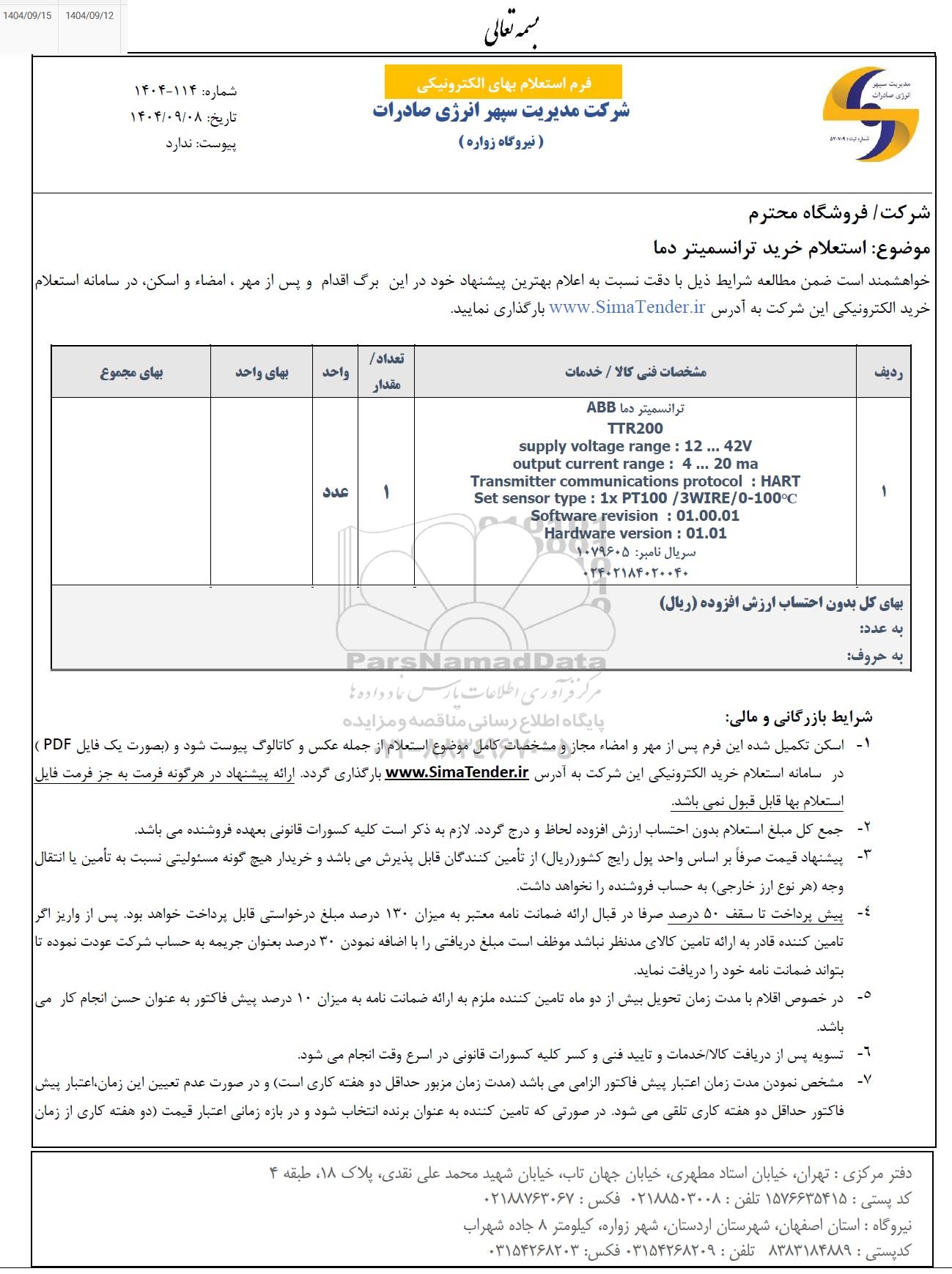 استعلام خرید ترانسمیتر دما , استعلام خرید ترانسمیتر دما