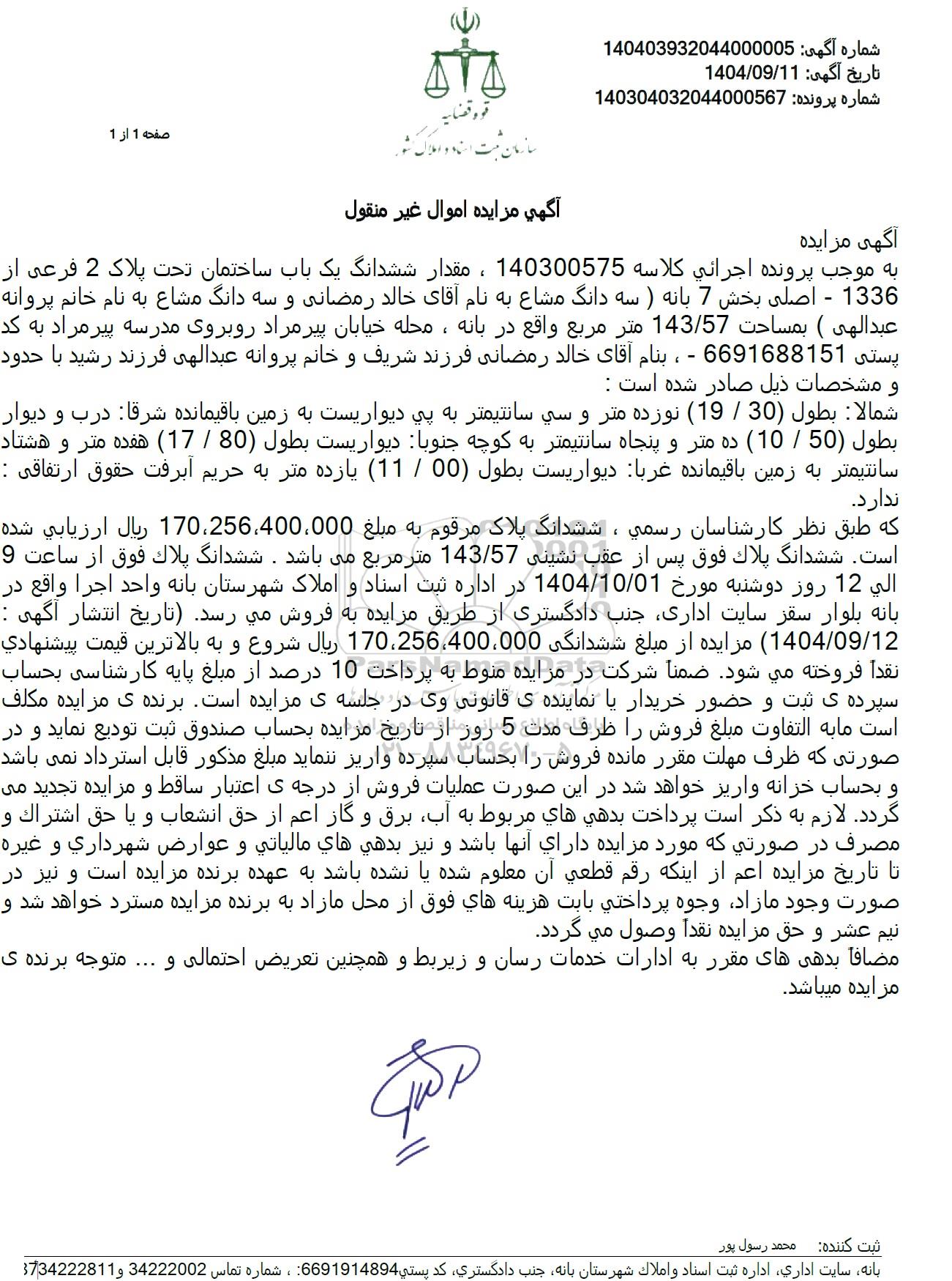که طبق نظر کارشناسان رسمی ششدانگ پلاک مرقوم به مبلغ 170.256.400.000  ریال ارزیابی شده است. ششدانگ پلاک فوق پس از عقب نشینی 143.57 متر مربع میباشد . ششدانگ پلاک فوق از ساعت 9 الی 12 روز دوشنبه مورخ 1404.10.01 در اداره ثبت اسناد و املاک شهرستان بانه واحد اجرا واقع در بانه بلوار سقز سایت اداری جنب دادگستری از طریق مزایده به فروش می رسد تاریخ انتشار آگهی : 1404.09.12 مزایده از مبلغ ششدانگی 170.256.400.000 ریال شروع و به بالاترین قیمت پیشنهادی نقداً فروخته میشود. ضمناً شرکت در مزایده منوط به پرداخت 10 درصد از مبلغ پایه کارشناسی بحساب سپرده ی ثبت و حضور خریدار یا نماینده ی قانونی وی در جلسه ی مزایده است. برنده ی مزایده مکلف است ما به التفاوت مبلغ فروش را ظرف مدت 5 روز از تاریخ مزایده بحساب صندوق ثبت تودیع نماید و در صورتی که ظرف مهلت مقرر مانده فروش را بحساب سپرده واریز ننماید مبلغ مذکور قابل استرداد نمی باشد و بحساب خزانه واریز خواهد شد در این صورت عملیات فروش از درجه ی اعتبار ساقط و مزایده تجدید می گردد. لازم به ذکر است پرداخت بدهی های مربوط به آب برق و گاز اعم از حق انشعاب و یا حق اشتراک و مصرف در صورتی که مورد مزایده دارای آنها باشد و نیز بدهی های مالیاتی و عوارض شهرداری و غیره تا تاریخ مزایده اعم از اینکه رقم قطعی آن معلوم شده یا نشده باشد به عهده برنده مزایده است و نیز در صورت وجود مازاد، وجوه پرداختی بابت هزینه های فوق از محل مازاد به برنده مزایده مسترد خواهد شد و نیم عشر و حق مزایده نقداً وصول می گردد.