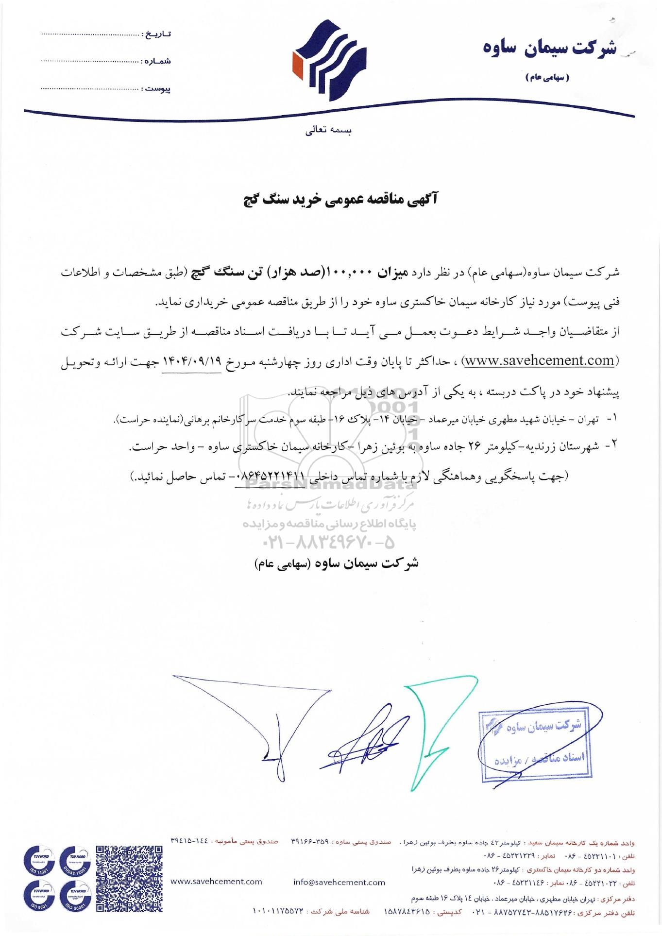 شرکت سیمان ساوه (سهامی عام) در نظر دارد میزان 100.000 (صدهزار) تن سنگ گچ (طبق مشخصات و اطلاعات فنی پیوست) مورد نیاز کارخانه سیمان خاکستری ساوه خود را از طریق مناقصه عمومی خریداری نماید.