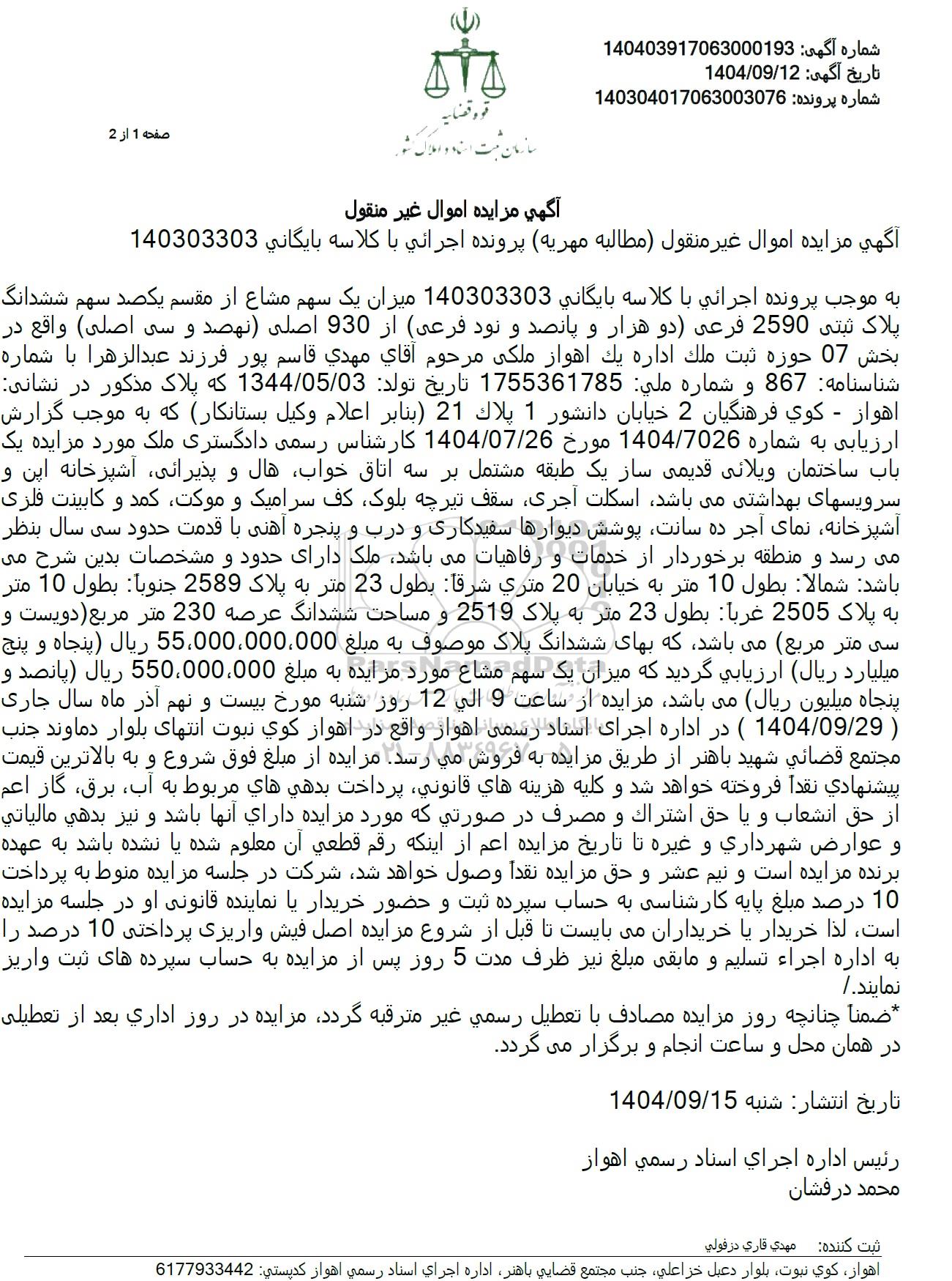 به موجب پرونده اجرائی با کلاسه بایگانی 140303303 میزان یک سهم مشاع از مقسم یکصد سهم ششدانگ پلاک ثبتی 2590 فرعی دو هزار و پانصد و نود فرعی از 930 اصلی نهصد و سی (اصلی) واقع در بخش 07 حوزه ثبت ملک اداره یک اهواز ملکی مرحوم آقای مهدی قاسم پور فرزند عبدالزهرا با شماره شناسنامه 867 و شماره ملی : 1755361785 تاریخ تولد: 1344.05.03 که پلاک مذکور در نشانی اهواز - کوی فرهنگیان 2 خیابان دانشور 1 پلاک 21 بنابر اعلام وکیل بستانکار که به موجب گزارش ارزیابی به شماره 1404.7026 مورخ 1404.07.26 کارشناس رسمی دادگستری ملک مورد مزایده یک باب ساختمان ویلانی قدیمی ساز یک طبقه مشتمل بر سه اتاق خواب هال و پذیرانی، آشپزخانه این و سرویسهای بهداشتی می باشد اسکلت آجری سقف تیرچه بلوک کف سرامیک و موکت کمد و کابینت فلزی آشپزخانه نمای آجر ده سانت پوشش دیوارها سفیدکاری و درب و پنجره آهنی با قدمت حدود سی سال بنظر میرسد و منطقه برخوردار از خدمات و رفاهیات میباشد ملک دارای حدود و مشخصات بدین شرح می باشد شمالا بطول 10 متر به خیابان 20 متری شرقاً بطول 23 متر به پلاک 2589 جنوباً بطول 10 متر به پلاک 2505 غرباً بطول 23 متر به پلاک 2519 و مساحت ششدانگ عرصه 230 متر مربع دویست و سی متر مربع می باشد که بهای ششدانگ پلاک موصوف به مبلغ 55.000.000.000 ریال پنجاه و پنج میلیارد ریال ارزیابی گردید که میزان یک سهم مشاع مورد مزایده به مبلغ 550.000.000 ریال پانصد و پنجاه میلیون ریال میباشد مزایده از ساعت 9 الی 12 روز شنبه مورخ بیست و نهم آذر ماه سال جاری (1404.9.29) در اداره اجرای اسناد رسمی اهواز واقع در اهواز کوی نبوت انتهای بلوار دماوند جنب مجتمع قضائی شهید باهنر از طریق مزایده به فروش می رسد. مزایده از مبلغ فوق شروع و به بالاترین قیمت پیشنهادی نقدا فروخته خواهد شد و کلیه هزینه های قانونی پرداخت بدهی های مربوط به آب برق گاز اعم از حق انشعاب و یا حق اشتراک و مصرف در صورتی که مورد مزایده دارای آنها باشد و نیز بدهی مالیاتی و عوارض شهرداری و غیره تا تاریخ مزایده اعم از اینکه رقم قطعی آن معلوم شده یا نشده باشد به عهده برنده مزایده است و نیم عشر و حق مزایده نقدا وصول خواهد شد شرکت در جلسه مزایده منوط به پرداخت 10 درصد مبلغ پایه کارشناسی به حساب سپرده ثبت و حضور خریدار یا نماینده قانونی او در جلسه مزایده است لذا خریدار یا خریداران می بایست تا قبل از شروع مزایده اصل فیش واریزی پرداختی 10 درصد را به اداره اجراء تسلیم و مابقی مبلغ نیز ظرف مدت 5 روز پس از مزایده به حساب سپرده های ثبت واریز نمایند. ضمنا چنانچه روز مزایده مصادف با تعطیل رسمی غیر مترقبه ،گردد مزایده در روز اداری بعد از تعطیلی در همان محل و ساعت انجام و برگزار می گردد.