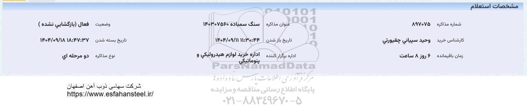 استعلام بها و موضوع استعلام استعلام سنگ سمباده به اطلاع کلیه شرکتها و افراد متخصص واجد شرایط میرساند، آگهی گذار در نظر دارد از طریق استعلام بها، نسبت به انتخاب و دریافت پیشنهادات اقدام نماید. این استعلام با کد آگهی ثبت شده در سامانه خبرگزاری پارس نماد : 9942196 منتشر شده است. مشخصات استعلام : تاریخ شروع استعلام: 1404/09/12 آخرین مهلت ارسال پیشنهاد قیمت : 1404/09/18 و محل اجرای پروژه : استان مناقصات استان اصفهان میباشد. استعلام قیمت مورد درخواست : استعلام سنگ سمباده با دستهبندیهای تخصصی و گروه های مرتبط : ابزار و یراق آلات, استعلام اطلاع رسانی میگردد.