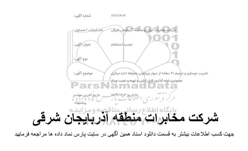 موضوع آگهی: تخریب و نوسازی و ترمیم 20 دهانه از دیوار پیرامونی محوطه اداره مرکزی همچنین لوله گذاری کابل کشی و تهیه و نصب چراغ