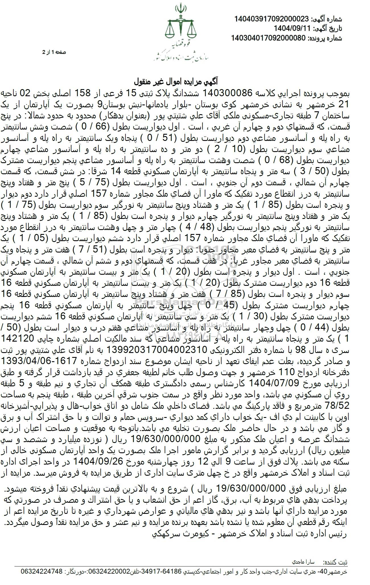 1 .بموجب پرونده اجرایی کلاسه 140300086 ششدانگ پلاک ثبتی 15 فرعی از 158 اصلی بخش 02 ناحیه 21 خرمشهر به نشانی خرمشهر کوی بوستان - بلوار یادمانها نبش بوستان 9 بصورت یک آپارتمان از یک ساختمان 7 طبقه تجاری مسکونی ملکی آقای علی شتیتی پور (بعنوان بدهکار محدود به حدود شمالا در پنج قسمت که قسمتهای دوم و چهارم آن غربی است. اول دیواریست بطول (66) . 0 ) شصت و شش سانتیمتر به راه پله و آسانسور مشاعی دوم دیواریست بطول (51) . 0 ) پنجاه و یک سانتیمتر به راه پله و آسانسور مشاعی سوم دیواریست بطول 10 . 2 ) دو متر و ده سانتیمتر به راه پله و آسانسور مشاعی چهارم دیواریست بطول 68 . 0 ) شصت و هشت سانتیمتر به راه پله و آسانسور مشاعی پنجم دیواریست مشترک بطول 50 . 3 ) سه متر و پنجاه سانتیمتر به آپارتمان مسکونی قطعه 14 شرقا در شش قسمت که قسمت چهارم آن شمالی ، قسمت دوم آن جنوبی، است. اول دیواریست بطول 75 . 5 ) پنج متر و هفتاد وپنج سانتیمتر به درز انقطاع مورد تفکیک که ماورا آن فضای ملک مجاور شماره 157 اصلی قرار دارد دوم دیوار و پنجره است بطول 85 . 1 ) یک متر و هشتاد و پنج سانتیمتر به نورگیر سوم دیواریست بطول (75 . 1 ) یک متر و هفتاد و پنج سانتیمتر به نورگیر چهارم دیوار و پنجره است بطول 85 . 1 ) یک متر و هشتاد وپنج سانتیمتر به نورگیر پنجم دیواریست بطول 48 . 4 ) چهار متر و چهل و هشت سانتیمتر به درز انقطاع مورد تفکیک که ماورا آن فضای ملک مجاور شماره 157 اصلی قرار دارد ششم دیواریست بطول 05 . 1 ) یک متر و پنج سانتیمتر به فضای معبر مجاور جنوبا دیوار و پنجره است بطول (51 . 7 ) هفت متر و پنجاه و یک سانتیمتر به فضای معبر مجاور غربا در هفت قسمت که قسمتهای دوم و ششم آن شمالی ، قسمت چهارم آن جنوبی ، است. اول دیوار و پنجره است بطول 20 . 1 ) یک متر و بیست سانتیمتر به آپارتمان مسکونی قطعه 16 دوم دیواریست مشترک بطول 20 . 1 ) یک متر و بیست سانتیمتر به آپارتمان مسکونی قطعه 16 سوم دیوار و پنجره است بطول 85 . 7 ) هفت متر و هشتاد و پنج سانتیمتر به آپارتمان مسکونی قطعه 16 چهارم دیواریست مشترک بطول 45 . 0 ( چهل وپنج سانتیمتر به آپارتمان مسکونی قطعه 16 ینجم دیواریست مشترک بطول 30 . 1 ) یک متر و سی سانتیمتر به آپارتمان مسکونی قطعه 16 ششم دیواریست بطول (44 . 0 ) چهل و چهار سانتیمتر به راه پله و آسانسور مشاعی هفتم درب و دیوار است بطول (50) .(1) یک متر و پنجاه سانتیمتر به راه پله و آسانسور مشاعی که سند مالکیت اصلی بشماره چاپی 142120 سری 5 سال 98 با شماره دفتر الکترونیکی 139920317004002310 به نام آقای علی شنیتی پور ثبت و صادر گردیده بعلت عدم ایفای تعهد از ناحیه ایشان موضوع سند ازدواج شماره 1617-1393.04.06 دفترخانه ازدواج 110 خرمشهر و جهت وصول طلب خانم لطیفه جعفری در قید بازداشت قرار گرفته و طبق ارزیابی مورخ 1404.07.09 کارشناس رسمی دادگستری طبقه همکف آن تجاری و نیم طبقه و 5 طبقه روی آن مسکونی می باشد واحد مورد نظر واقع در سمت جنوب شرقی آخرین طبقه ، طبقه پنجم به مساحت 78.52 متر مربع و فاقد پارکینگ می باشد. فضای داخلی ملک شامل دو اتاق خواب هال و پذیرایی آشپزخانه اوین با کابینت ام دی اف یک خواب دارای کمد دیواری - سرویس حمام و توالت و با حق اشتراک آب و برق و گاز میباشد و در حال حاضر ملک بصورت تخلیه می باشد. با توجه به موقعیت و مساحت اعیان ارزش ششدانگ عرصه و اعیان ملک مذکور به مبلغ 19.630.000.000 ریال ) نوزده میلیارد و ششصد و سی میلیون ریال ارزیابی گردید و برابر گزارش مامور اجرا ملک بصورت یک واحد آپارتمان مسکونی خالی از سکنه می باشد. پلاک فوق از ساعت 9 الی 12 روز چهارشنبه مورخ 1404.09.26 در واحد اجرای اداره ثبت اسناد و املاک خرمشهر واقع در خ چهل متری سایت اداری از طریق مزایده به فروش میرسد. مزایده از