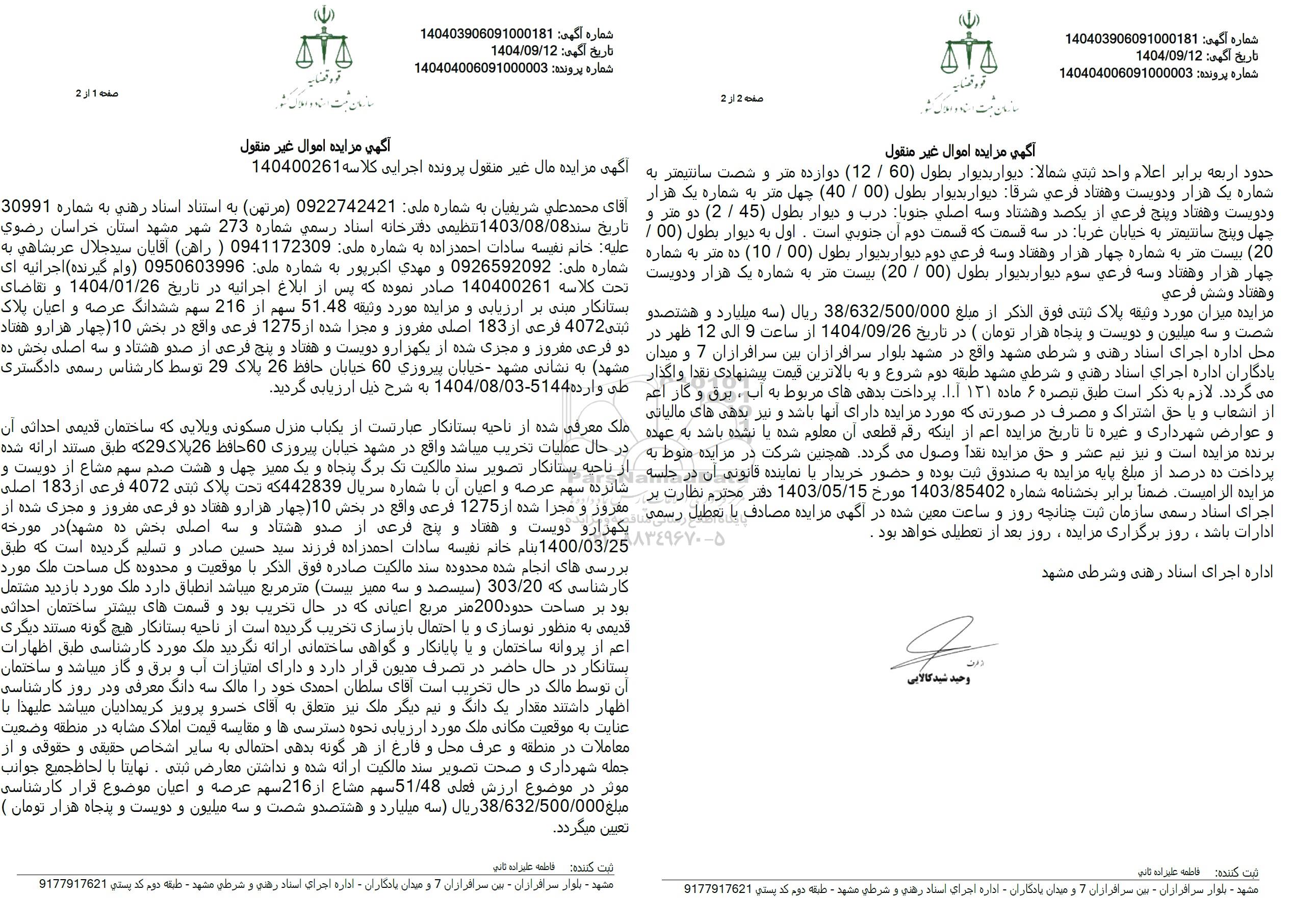 مزایده میزان مورد وثیقه پلاک ثبتی فوق الذکر از مبلغ 38.632.500.000 ريال سه میلیارد و هشتصد و شصت و سه میلیون و دویست و پنجاه هزار تومان ) در تاریخ 1404.09.26 از ساعت 9 الی 12 ظهر در محل اداره اجرای استاد رهنی و شرطی مشهد واقع در مشهد بلوار سرافرازان بین سرافرازان 7 و میدان یادگاران اداره اجرای استاد رهني و شرطي مشهد طبقه دوم شروع و به بالاترین قیمت پیشنهادی نقدا واگذار می گردد. لازم به ذکر است طبق تبصره 6 ماده 131 1.1. پرداخت بدهی های مربوط به آب ، برق و گاز اعم از انشعاب و یا حق اشتراک و مصرف در صورتی که مورد مزایده دارای آنها باشد و نیز بدهی های مالیاتی و عوارض شهرداری و غیره تا تاریخ مزایده اعم از اینکه رقم قطعی آن معلوم شده یا نشده باشد به عهده برنده مزایده است و نیز نیم عشر و حق مزایده نقداً وصول میگردد. همچنین شرکت در مزایده منوط به پرداخت ده درصد از مبلغ پایه مزایده به صندوق ثبت بوده و حضور خریدار یا نماینده قانونی آن در جلسه مزایده الزامیست. ضمنا برابر بخشنامه شماره 1403.85402 مورخ 1403.05.15 دفتر محترم نظارت بر اجرای اسناد رسمی سازمان ثبت چنانچه روز و ساعت معین شده در آگهی مزایده مصادف با تعطیل رسمی ادارات باشد. روز برگزاری مزایده، روز بعد از تعطیلی خواهد بود .
