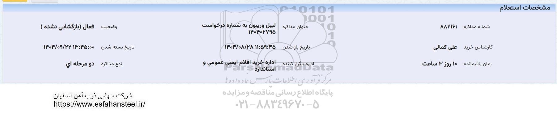 | شماره مذاکره 882161 | عنوان مذاکره: لیبل و ریبون به شماره درخواست 140402795 | وضعیت فعال (بازگشایی نشده) |