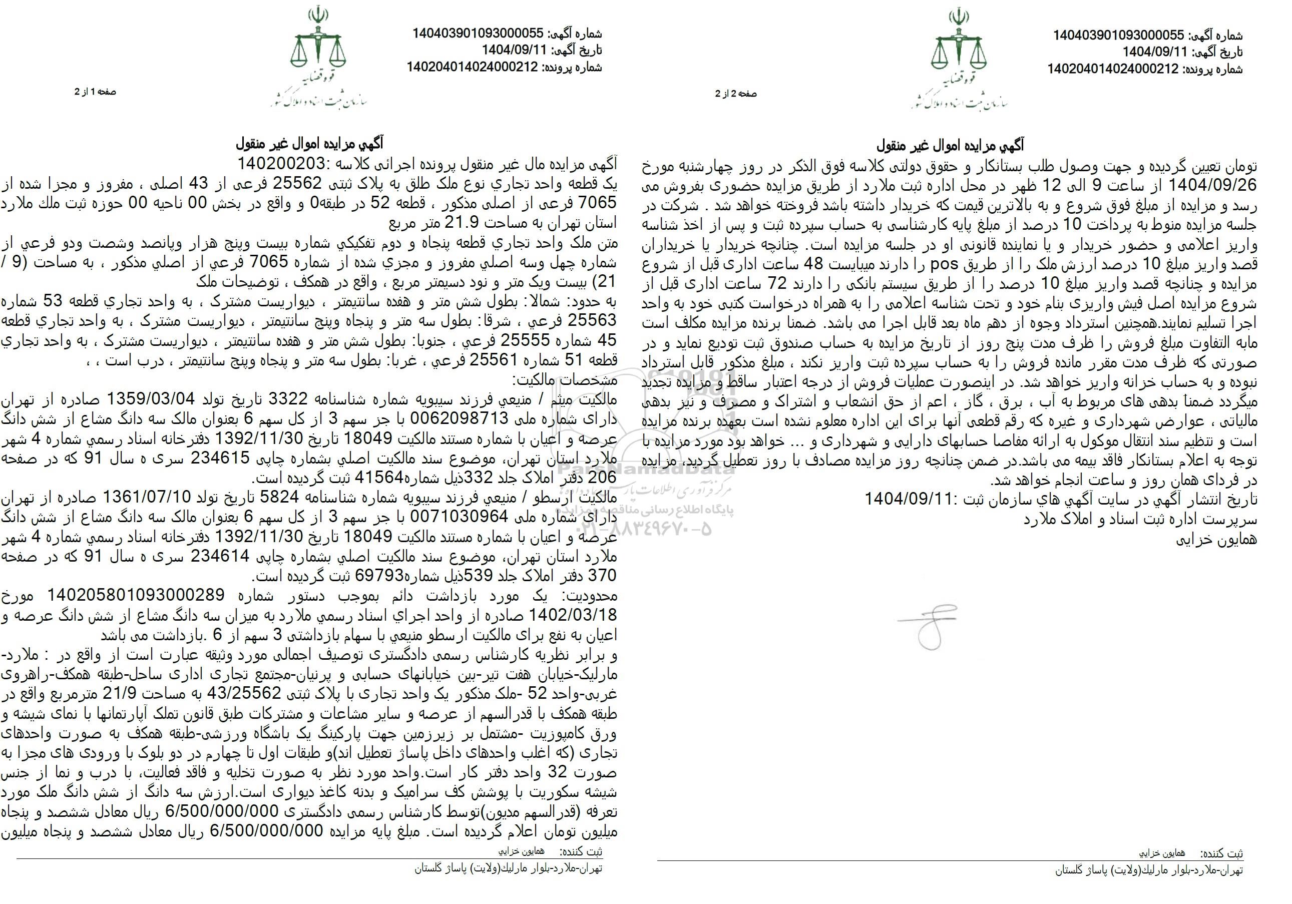 یک قطعه واحد تجاری نوع ملک طلق به پلاک ثبتی 25562 فرعی از 43 اصلی، مفرور و مجرا شده از 7065 فرعی از اصلی مذکور، قطعه 52 در طبقه 0 و واقع در بخش 00 ناحیه 00 حوزه ثبت ملک ملارد استان تهران به مساحت 21.9 متر مربع