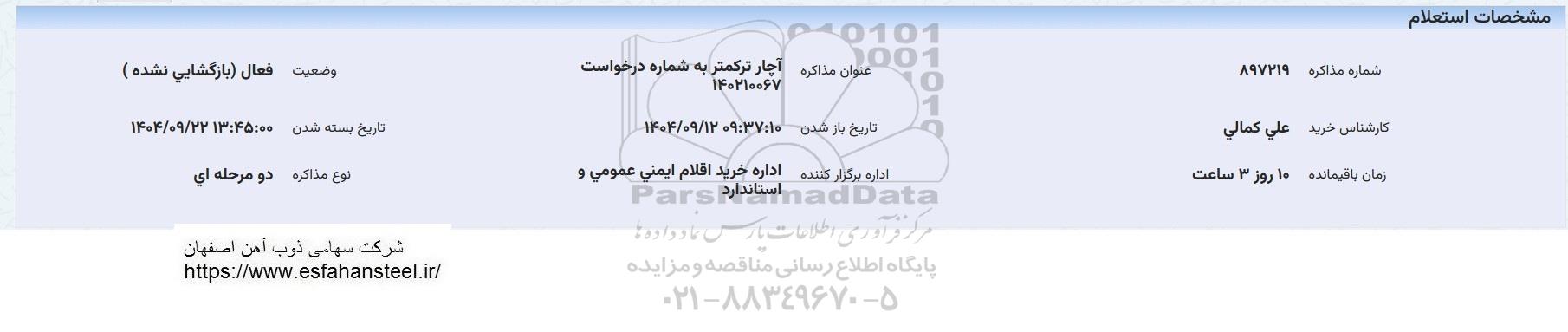 | زمان باقیمانده 10 روز 3 ساعت | اداره برگزار کننده اداره خرید اقلام ایمنی عمومی و استاندارد | نوع مذاکره دو مرحله ای |