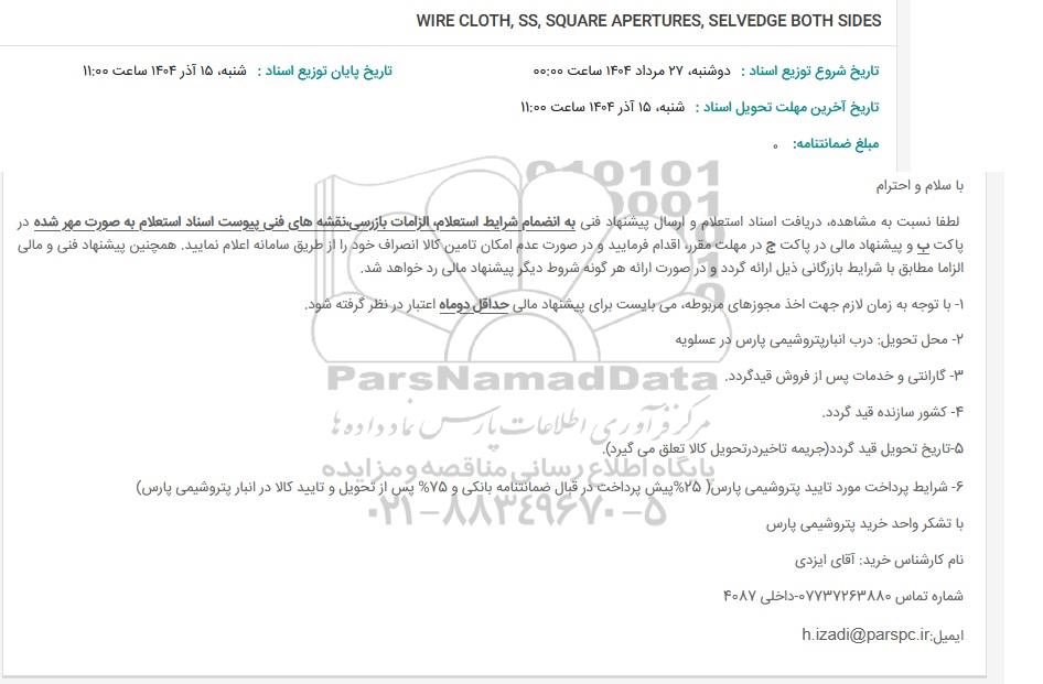 استعلام بها و موضوع استعلام استعلام WIRE CLOTH, SS, SQUARE APERTURES, SELVEDGE BOTH SIDES به اطلاع کلیه شرکت‌ها و افراد متخصص واجد شرایط می‌رساند، آگهی گذار در نظر دارد از طریق استعلام بها، نسبت به انتخاب و دریافت پیشنهادات اقدام نماید. این استعلام با کد آگهی ثبت شده در سامانه خبرگزاری پارس نماد : 9942220 منتشر شده است. مشخصات استعلام : تاریخ شروع استعلام: 1404/09/12 آخرین مهلت ارسال پیشنهاد قیمت : 1404/09/15 و محل اجرای پروژه : استان مناقصات استان بوشهر میباشد. استعلام قیمت مورد درخواست : استعلام WIRE CLOTH, SS, SQUARE APERTURES, SELVEDGE BOTH SIDES با دسته‌بندی‌های تخصصی و گروه های مرتبط : نخ و پارچه, تجهیزات نفت و گاز, استعلام اطلاع رسانی میگردد.