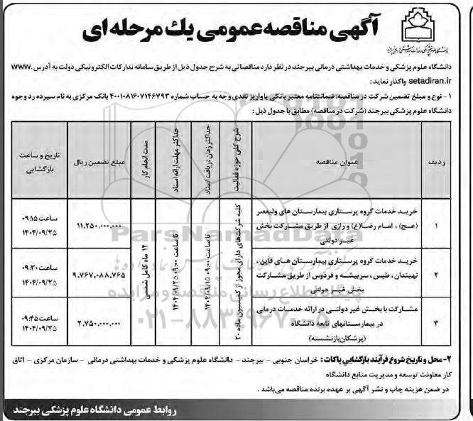 | 2 | خرید خدمات گروه پرستاری بیمارستانهای قاین ، نهبندان ، طبس ، سربیشه و فردوس از طریق مشارکت بخش غری دولتی | 9.767.088.765 | ساعت 9:30 1404.9.25 |