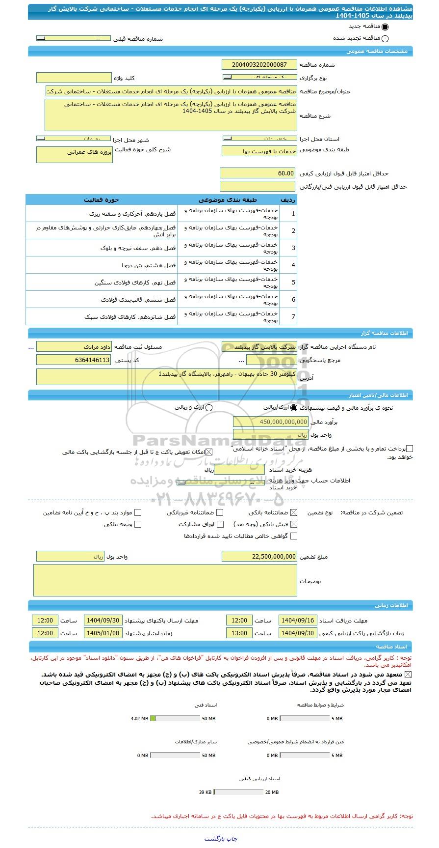 | نام دستگاه اجرایی مناقصه گزار | شرکت پالایش گاز بیدبلند | مسئول ثبت مناقصه | داود مرادی |