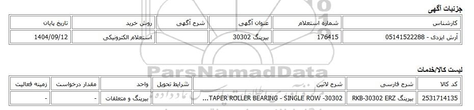 | آرش ایزدی - 05141522288 | 176415 | بیرینگ 30302 | استعلام الکترونیکی | 1404/09/12 |