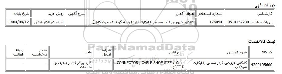 مهران دیوان - 05141522301176054کانکتور خروجی فیدر مسی با ابکاری نقره) پنجه گربه ای بدون کابل(استعلام الکترونیکی1404/09/12