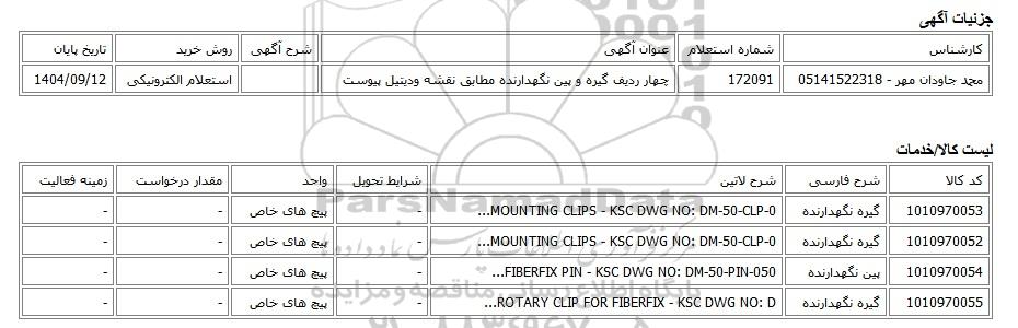 محمد جاودان مهر - 05141522318172091چهار ردیف گیره و پین نگهدارنده مطابق نقشه ودیتیل پیوستاستعلام الکترونیکی1404/09/12