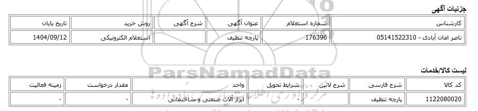 | ناصر امان آبادی - 05141522310 | 176396 | پارچه تنظیف | استعلام الکترونیکی | 1404/09/12 |
