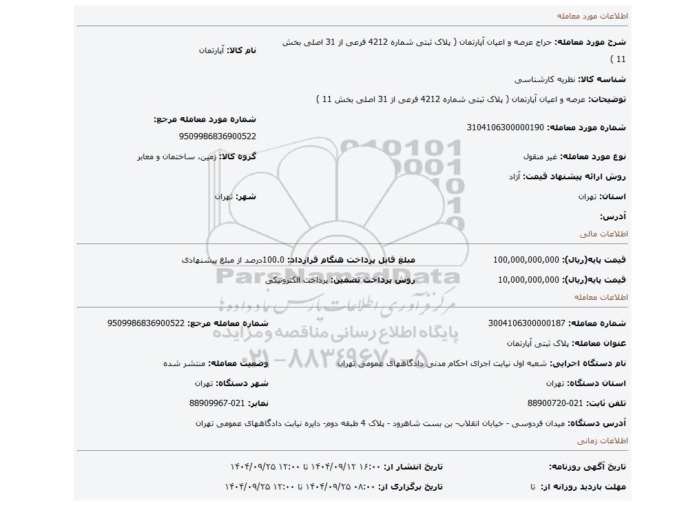 | شرح مورد معامله: حراج عرصه و اعیان آپارتمان ( پلاک ثبتی شماره 4212 فرعی از 31 اصلی بخش 11 ) | نام کالا: آپارتمان | |