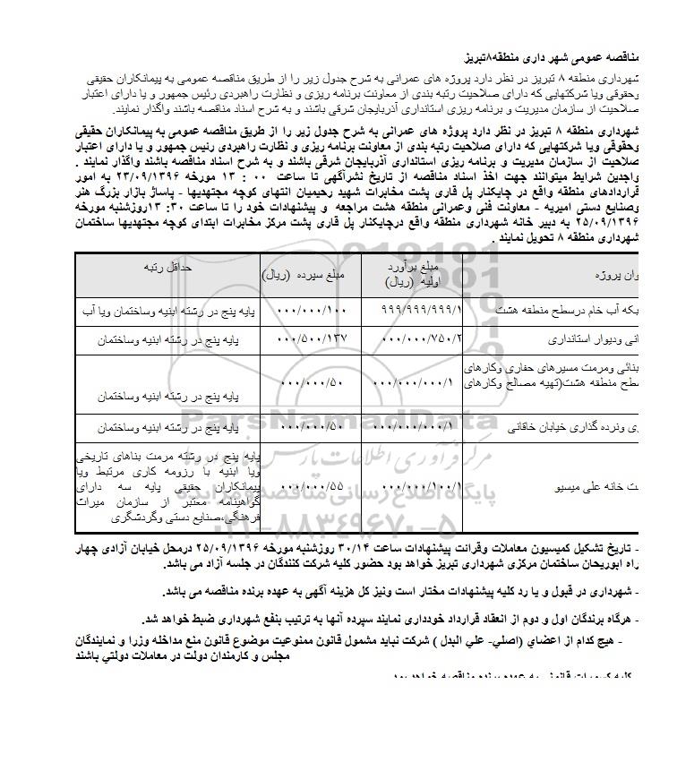 شهرداری منطقه 8 تبریز در نظر دارد پروژه های عمرانی به شرح جدول زیر را از طریق مناقصه عمومی به پیمانکاران حقیقی وحقوقی ویا شرکتهایی که دارای صلاحیت رتبه بندی از معاونت برنامه ریزی و نظارت راهبردی رئیس جمهور و یا دارای اعتبار صلاحیت از سازمان مدیریت و برنامه ریزی استانداری آذربایجان شرقی باشند و به شرح اسناد مناقصه باشند واگذار نمایند . واجدین شرایط میتوانند جهت اخذ اسناد مناقصه از تاریخ نشرآگهی تا ساعت 00 : 13 مورخه 96.9.23 به امور قراردادهای منطقه واقع در چایکنار پل قاری پشت مخابرات شهید رحیمیان انتهای کوچه مجتهدیها - پاساژ بازار بزرگ هنر وصنایع دستی امیریه - معاونت فنی وعمرانی منطقه هشت مراجعه و پیشنهادات خود را تا ساعت 30: 13روزشنبه مورخه 96.9.25 به دبیر خانه شهرداری منطقه واقع درچایکنار پل قاری پشت مرکز مخابرات ابتدای کوچه مجتهدیها ساختمان شهرداری منطقه 8 تحویل نمایند .