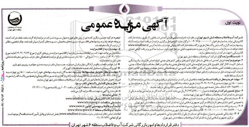 شرکت آب و فاضلاب منطقه شش شهر تهران در نظر دارد تا مزایده عمومی فروش اجناس اسقاطی را از طریق سامانه تدارکات الکترونیکی دولت  به شماره فراخوان 1004092500000001 برگزار نماید.کلیه مراحل برگزاری مزایده از دریافت اسناد مزایده تا ارائه پیشنهاد مزایده گران و گشایش پاکت ها از طریق درگاه سامانه تدارکات الکترونیکی دولت (ستاد) به آدرس ستاد ایران انجام خواهد شد و لازم است مزایده گران در صورت عدم عضویت قبلی، مراحل ثبت نام در سایت مذکور و دریافت گواهی امضای الکترونیکی را جهت شرکت در مزایده محقق سازند.
