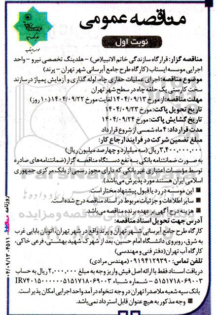 موضوع مناقصه: اجرای عملیات حفاری چاه، لوله گذاری و آزمایش پمپاژ درسازند سخت كارستی یک حلقه چاه در سطح شهر تهران
