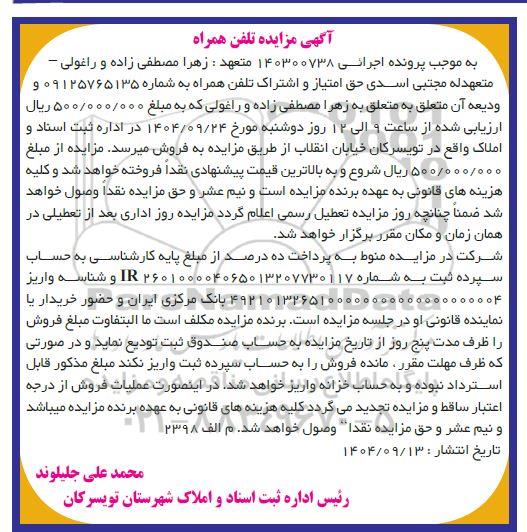 به موجب پرونده اجرائی 140300738 متعهد : زهرا مصطفی زاده و راغولی -متعهدله مجتبی اسدی حق امتیاز و اشتراک تلفن همراه به شماره 09125765135 و ودیعه آن متعلق به متعلق به زهرا مصطفی زاده و راغولی که به مبلغ 500.000.000 ریال ارزیابی شده از ساعت 9 الی 12 روز دوشنبه مورخ 1404.09.24 در اداره ثبت اسناد و املاک واقع در تویسرکان خیابان انقلاب از طریق مزایده به فروش میرسد. مزایده از مبلغ 500.000.000 ریال شروع و به بالاترین قیمت پیشنهادی نقدا فروخته خواهد شد و کلیه هزینه های قانونی به عهده برنده مزایده است و نیم عشر و حق مزایده نقدا وصول خواهد شد ضمنا چنانچه روز مزایده تعطیل رسمی اعلام گردد مزایده روز اداری بعد از تعطیلی در همان زمان و مکان مقرر برگزار خواهد شد.