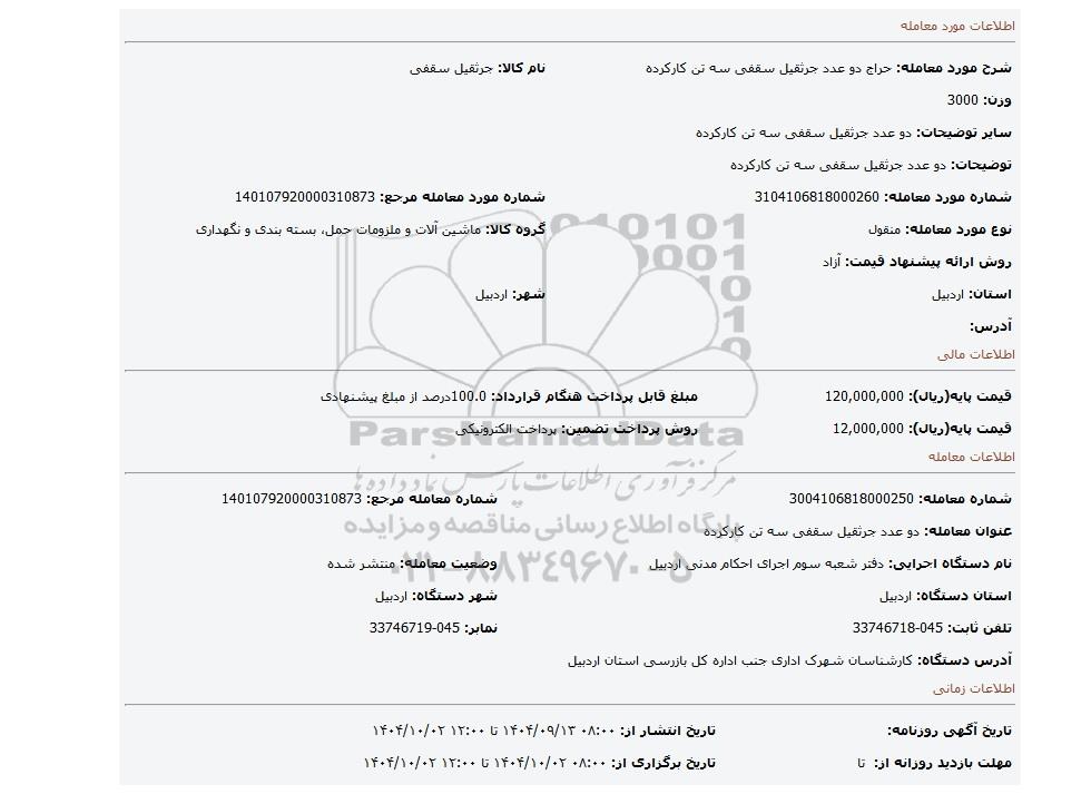 | شماره مورد معامله: 3104106818000260 | شماره مورد معامله مرجع: 140107920000310873 | |