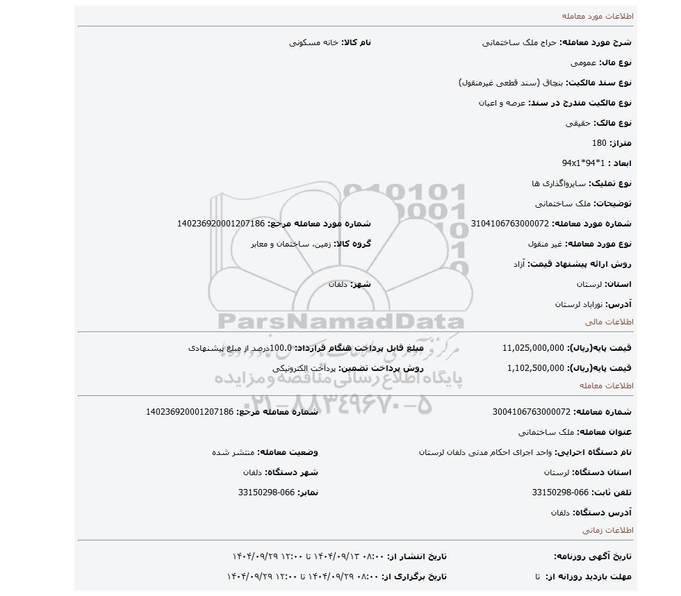 مزایده عمومی مزایده ملک ساختمانی برگزار میگردد. از کلیه افراد متخصص و شرکتهای واجد شرایط دعوت به عمل میآید تا در این مزایده با کد خبرگزاری پارس نماد : 9944100 شرکت نمایند تاریخ شروع مزایده : 1404/09/13 مهلت شرکت در مزایده: تا پایان روز 1404/09/29 مکان برگزاری اموال واگذاری استانهای مزایدات استان لرستان و دستهبندیهای مربوط به این حراجی املاک و زمین میباشد.