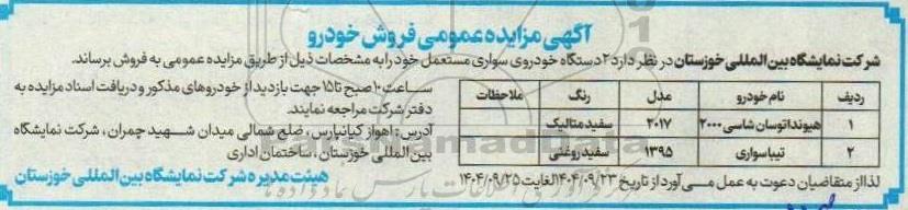 شرکت نمایشگاه بین المللی خوزستان در نظر دارد 2 دستگاه خودروی سواری مستعمل خود را به مشخصات ذیل از طریق مزایده عمومی به فروش برساند.