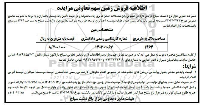 شرکت تعاونی هزار باغ دشت سیاخ در نظر دارد در خصوص رفع مشکلات اشتراک برق چاه مجموعه و در جهت تأمین رفاه بیشتر باغداران و با توجه به تصویب مجمع عمومی مورخ 1404.04.23 نسبت به فروش یک پلاک زمین هیه از طرف موسسه احیاگران توسعه فارس به شرکت تعاونی هزار باغ دشت سیاخ به مساحت 1464 متر مربع با مشخصات ذیل اقدام نماید.