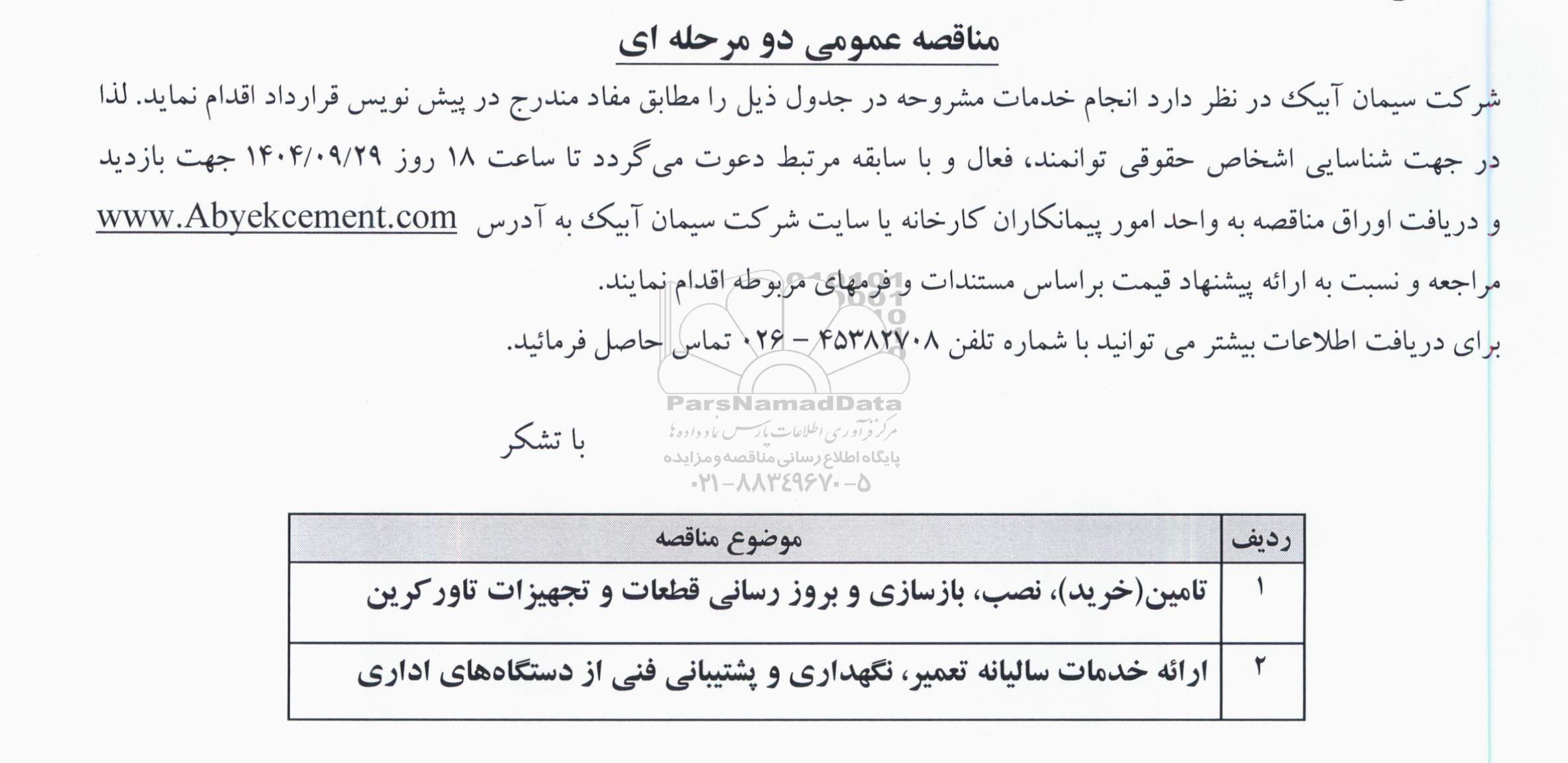 شرکت سیمان آبیک در نظر دارد انجام خدمات مشروحه در جدول ذیل را مطابق مفاد مندرج در پیش نویس قرارداد اقدام نماید. لذا در جهت شناسایی اشخاص حقوقی توانمند، فعال و با سابقه مرتبط دعوت میگردد تا ساعت 18 روز 1404.09.29 جهت بازدید و دریافت اوراق مناقصه به واحد امور پیمانکاران کارخانه یا سایت شرکت سیمان آبیک به آدرس www.Abyekcement.com مراجعه و نسبت به ارائه پیشنهاد قیمت بر اساس مستندات و فرمهای مربوطه اقدام نمایند.
