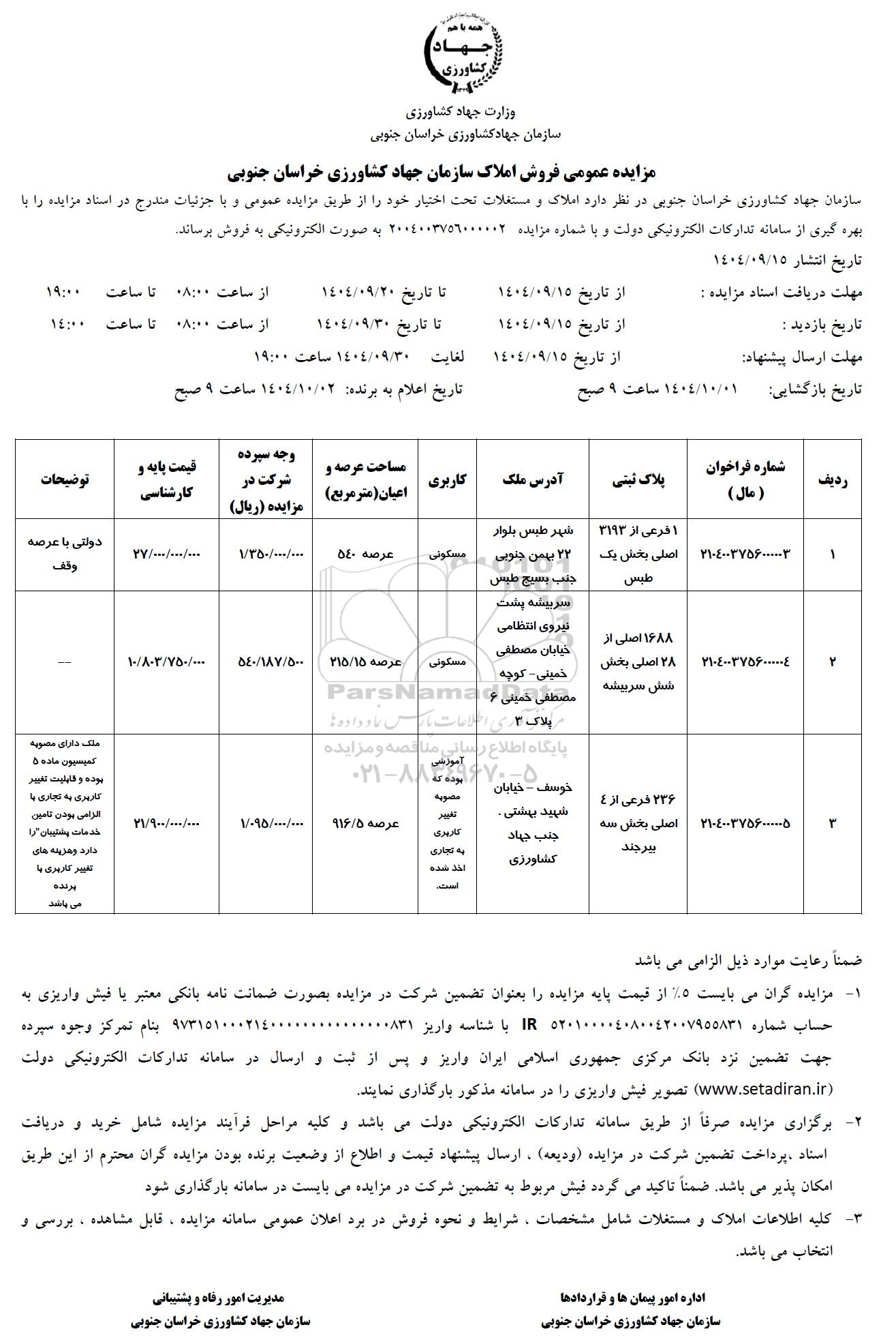 مزایده عمومی فروش املاک سازمان جهاد کشاورزی خراسان جنوبی