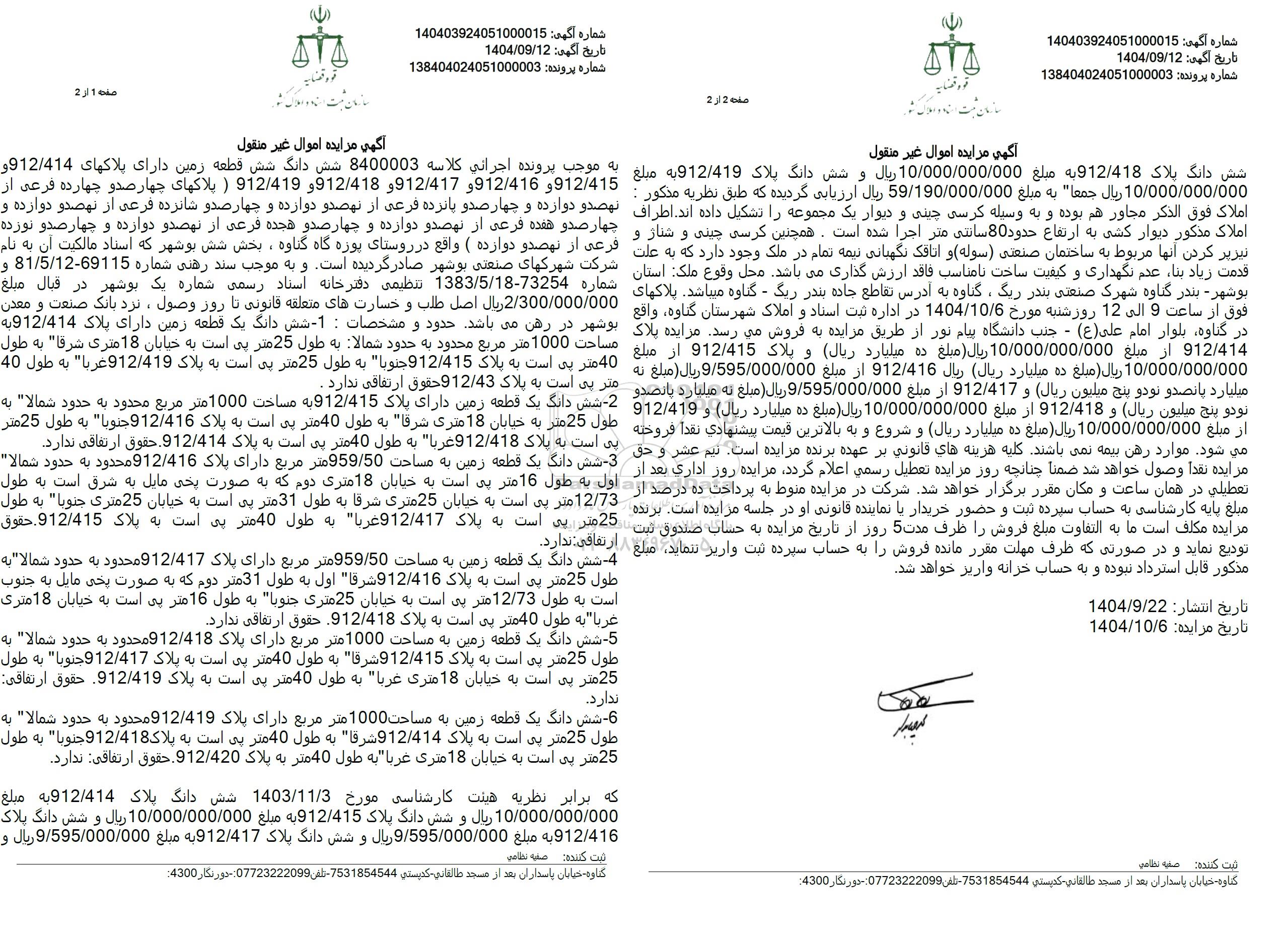 که برابر نظریه هیئت کارشناسی مورخ 1403.11.3 شش دانگ پلاک 912.414 به مبلغ 10.000.000.000 ریال و شش دانگ پلاک 912.415 به مبلغ 10.000.000.000 ریال و شش دانگ پلاک 912.416 به مبلغ 9.595.000.000 ريال و شش دانگ پلاک 912.417  به مبلغ 9.595.000.000 ریال و شش دانگ پلاک 912.418 به مبلغ 10.000.000.000 ریال و شش دانگ پلاک 912.419 به مبلغ 10.000.000.000 ریال ارزیابی گردیده که طبق نظریه مذکور : املاک فوق الذكر مجاور هم بوده و به وسیله کرسی چینی و دیوار یک مجموعه را تشکیل داده اند. اطراف املاک مذکور دیوار کشی به ارتفاع حدود 80 سانتی متر اجرا شده است. همچنین کرسی چینی و شناز و نیزیز کردن آنها مربوط به ساختمان صنعتی (سوله) و اتاقک نگهبانی نیمه تمام در ملک وجود دارد که به علت قدمت زیاد بنا، عدم نگهداری و کیفیت ساخت نامناسب فاقد ارزش گذاری می باشد. محل وقوع ملک استان بوشهر - بندر گناوه شهرک صنعتی بندر ریگ، گناوه به آدرس تقاطع جاده بندر ریگ - گناوه میباشد. پلاکهای فوق از ساعت 9 الی 12 روزشنبه مورخ 1404.10.6 در اداره ثبت اسناد و املاک شهرستان گناوه واقع در گناوه بلوار امام علی (ع) - جنب دانشگاه پیام نور از طریق مزایده به فروش می رسد. مزایده پلاک 912/414 از مبلغ 10.000.000.000 ریال (مبلغ ده میلیارد) ریال و پلاک 912/415 از مبلغ 10.000.000.000 ريال (مبلغ ده میلیارد ریال) ریال 912/416 از مبلغ 9.595.000.000 ریال مبلغ (نه میلیارد پانصد و نودو پنج میلیون ریال) و 912/417 از مبلغ 9.595.000.000 ریال مبلغ (نه میلیارد پانصدو نودو پنج میلیون ریال) و 912/418 از مبلغ 10.000.000.000 ريال ( مبلغ ده میلیارد ریال) و 912/419 از مبلغ 10.000.000.000 ریال مبلغ (ده میلیارد ریال) و شروع و به بالاترین قیمت پیشنهادی نقدا فروخته می شود. موارد رهن بیمه نمی باشند. کلیه هزینه های قانونی بر عهده برنده مزایده است. نیم عشر و حق مزایده نقداً وصول خواهد شد ضمنا چنانچه روز مزایده تعطیل رسمی اعلام گردد مزایده روز اداری بعد از تعطیلی در همان ساعت و مکان مقرر برگزار خواهد شد. شرکت در مزایده منوط به پرداخت ده درصد از مبلغ پایه کارشناسی به حساب سپرده ثبت و حضور خریدار با نماینده قانونی او در جلسه مزایده است. برنده مزایده مکلف است ما به التفاوت مبلغ فروش را ظرف مدت 5 روز از تاریخ مزایده به حساب صندوق ثبت تودیع نماید و در صورتی که ظرف مهلت مقرر مانده فروش را به حساب سپرده ثبت واریز ننماید، مبلغ ارتفاقی ندارد. مذکور قابل استرداد نبوده و به حساب خزانه واریز خواهد شد.